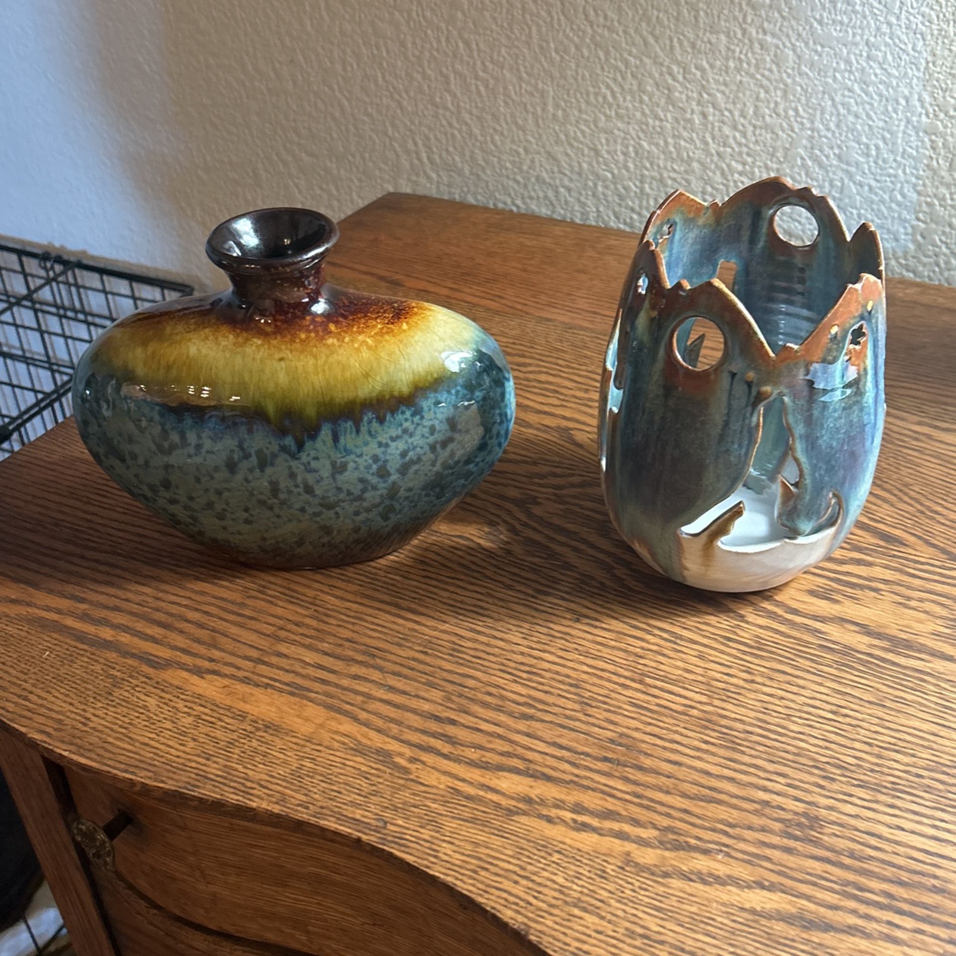 Beautiful pottery pieces can be purchased separate or together. $15 for the vase and $20 for signed candle holder. Together $30