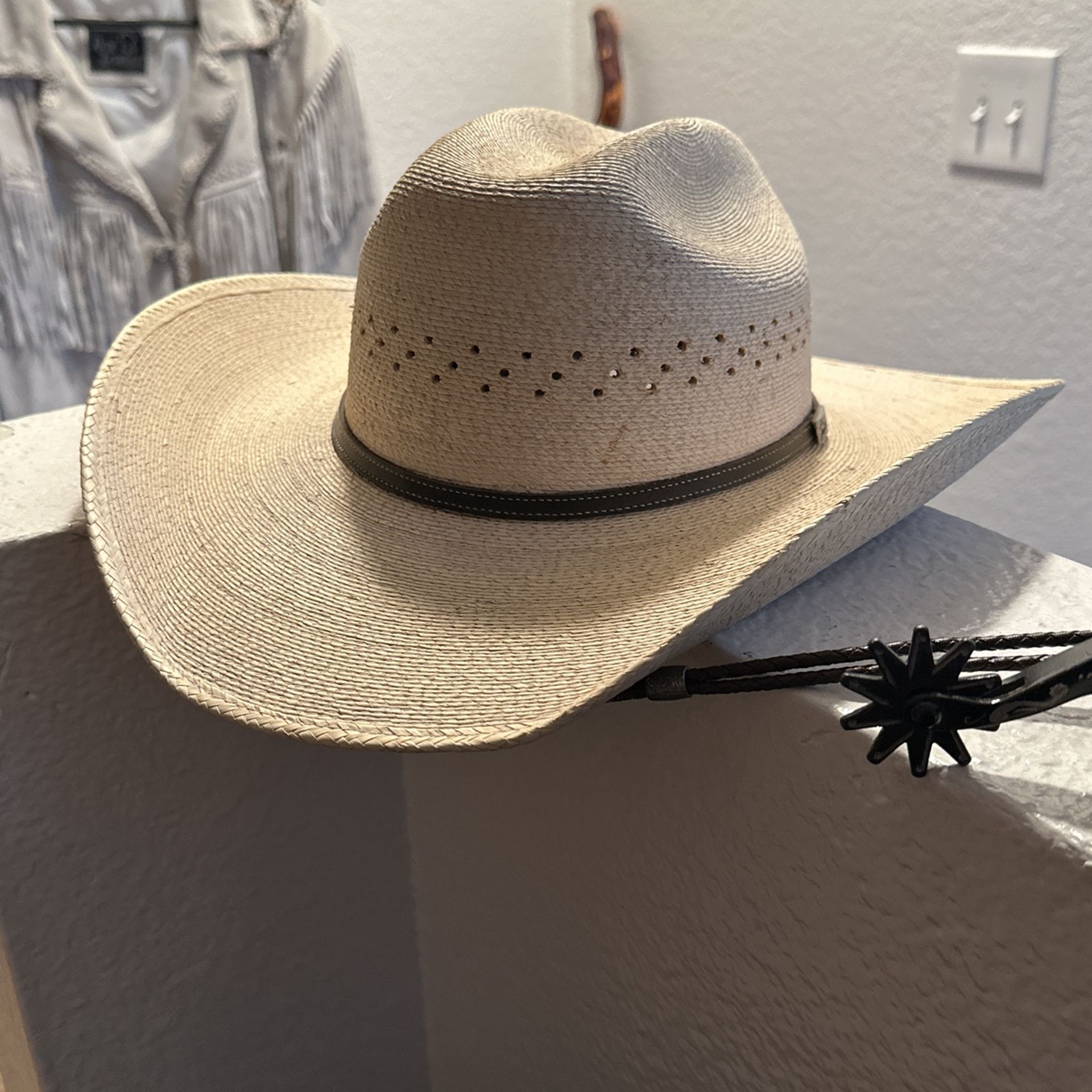 Palm leaf cowboy hat w band and stampede string (chin strap) lightly used in great condition. Atwood brand size 7 1/2