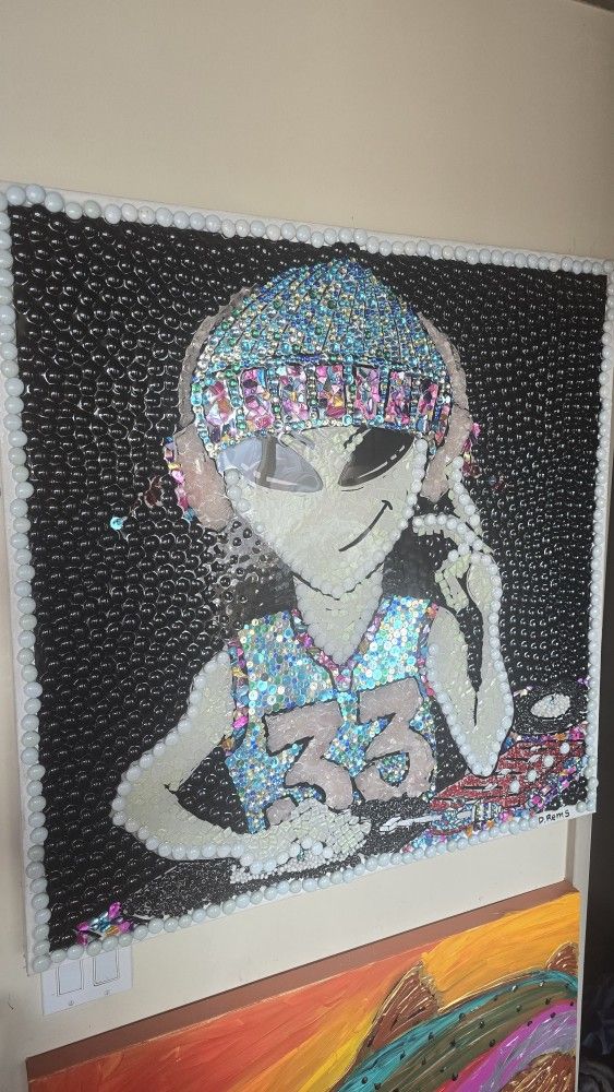 3' x 3' mixed media, it's like a mosaic set with epoxy over the top. It's really cool in the sun light or light in general.