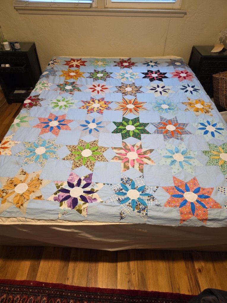 This makes me smile! So vibrant and cheerful. Completely Handstitched cotton top only quilt . No condition issues . Id probably handwash this if you want, some people like them left alone so I didn't do 78 x 90". Thanks!