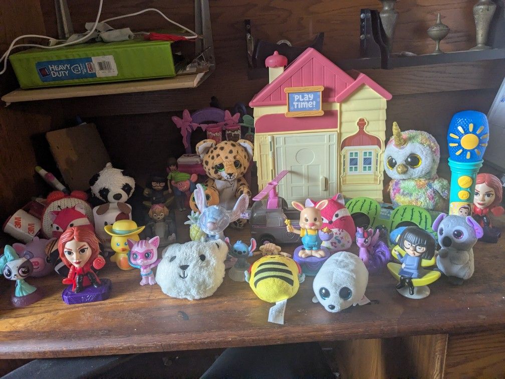 Includes plushes, playsets, and action figures, 40+ pieces for $15 total, more affordable toys can be found in my listings above this listing