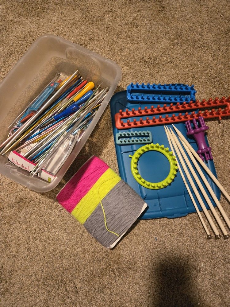 Assortment of knitting supplies. Includes looms, needles, yarn, instruction booklets, and more. All gently used. Includes box in picture.