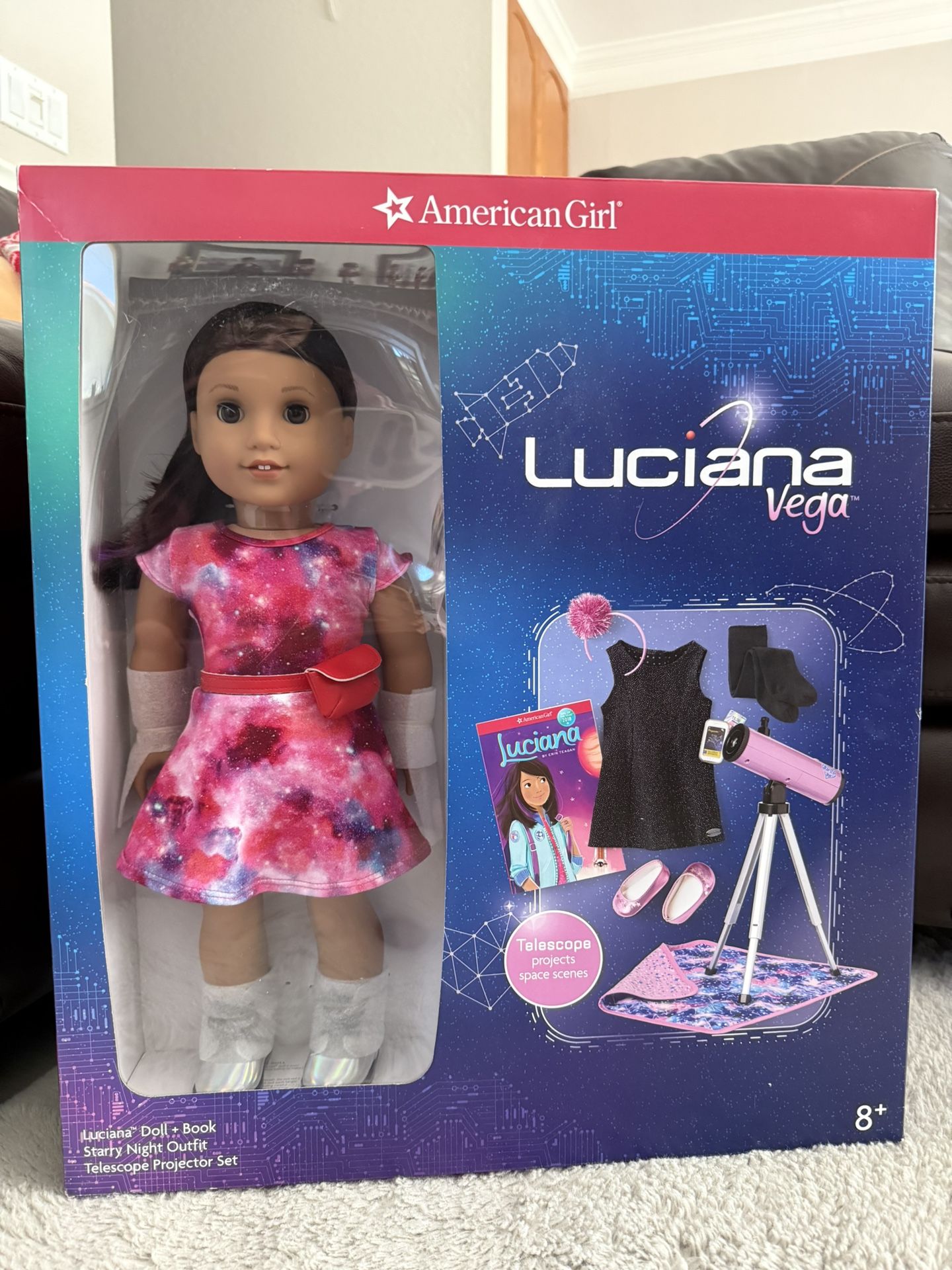 American Girl Luciana Vega Doll Set - NEW IN UNOPENED BOX! Selling the original Luciana Vega, the 2018 Girl of the Year. This set is brand new and has never been opened, making it a perfect gift for the holidays or a collector. Luciana is an aspiring astronaut with a passion for STEM and includes her signature outfit, accessories, and book. Set Includes: * Luciana 18-inch Doll * "Starry Night" Dress, Belt Bag, and Boots * Luciana's Book * Telescope Projector Set (Telescope, Stand, Projector Slide, Star Chart, and more!) Condition: Brand New in Factory Sealed Box. Box is in excellent condition. Cross posted