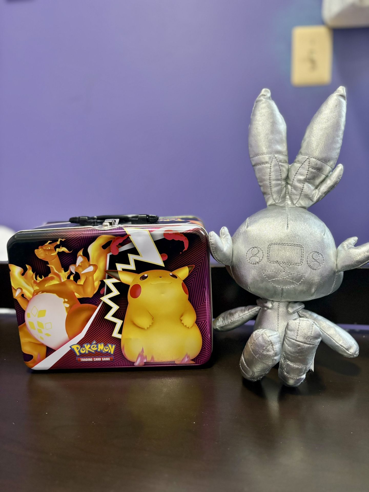 Shelling this Pokémon trading card lunch box and plushie asking $35 for both, midway area