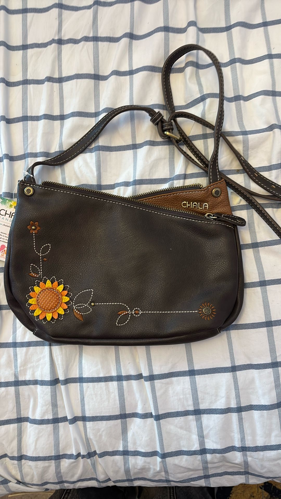 Chala Sunflower Criss Crossbody bag made of brown faux leather with an adjustable strap