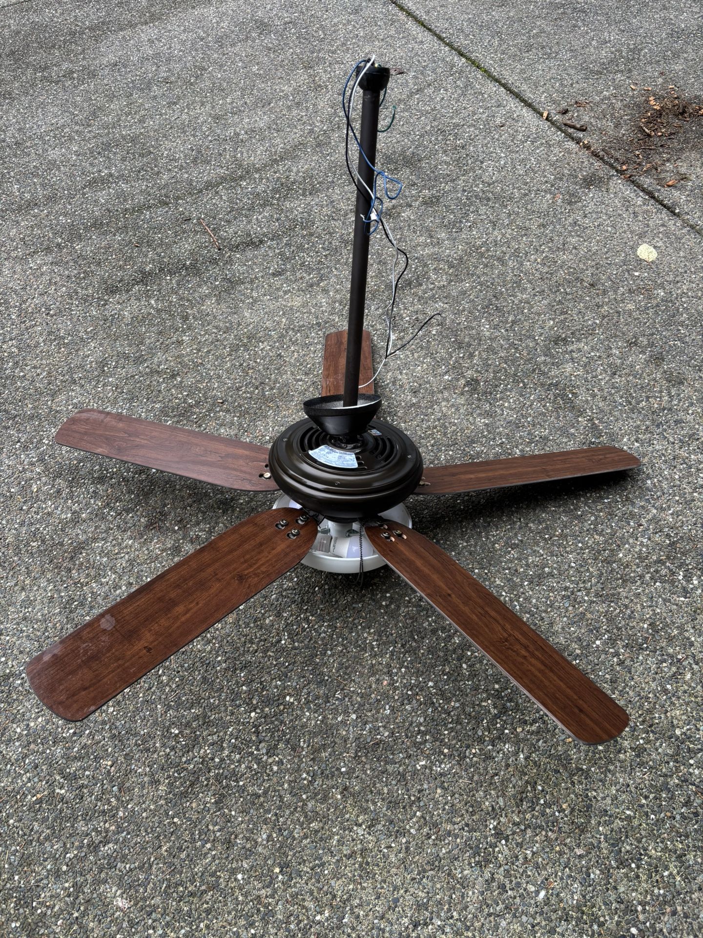 Simple five bladed, three bulb ceiling fan. Works fine. No issues. We’re remodeling the space and it’s not going to fit the aesthetic. Similar to the Hampton model from Home Depot with three foot mounting pole.