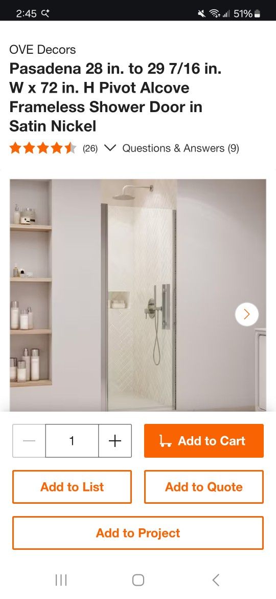 New Pasadena 28 in. to 29 7/16 in. W x 72 in. H Pivot Alcove Frameless Shower Door in Satin Nickel