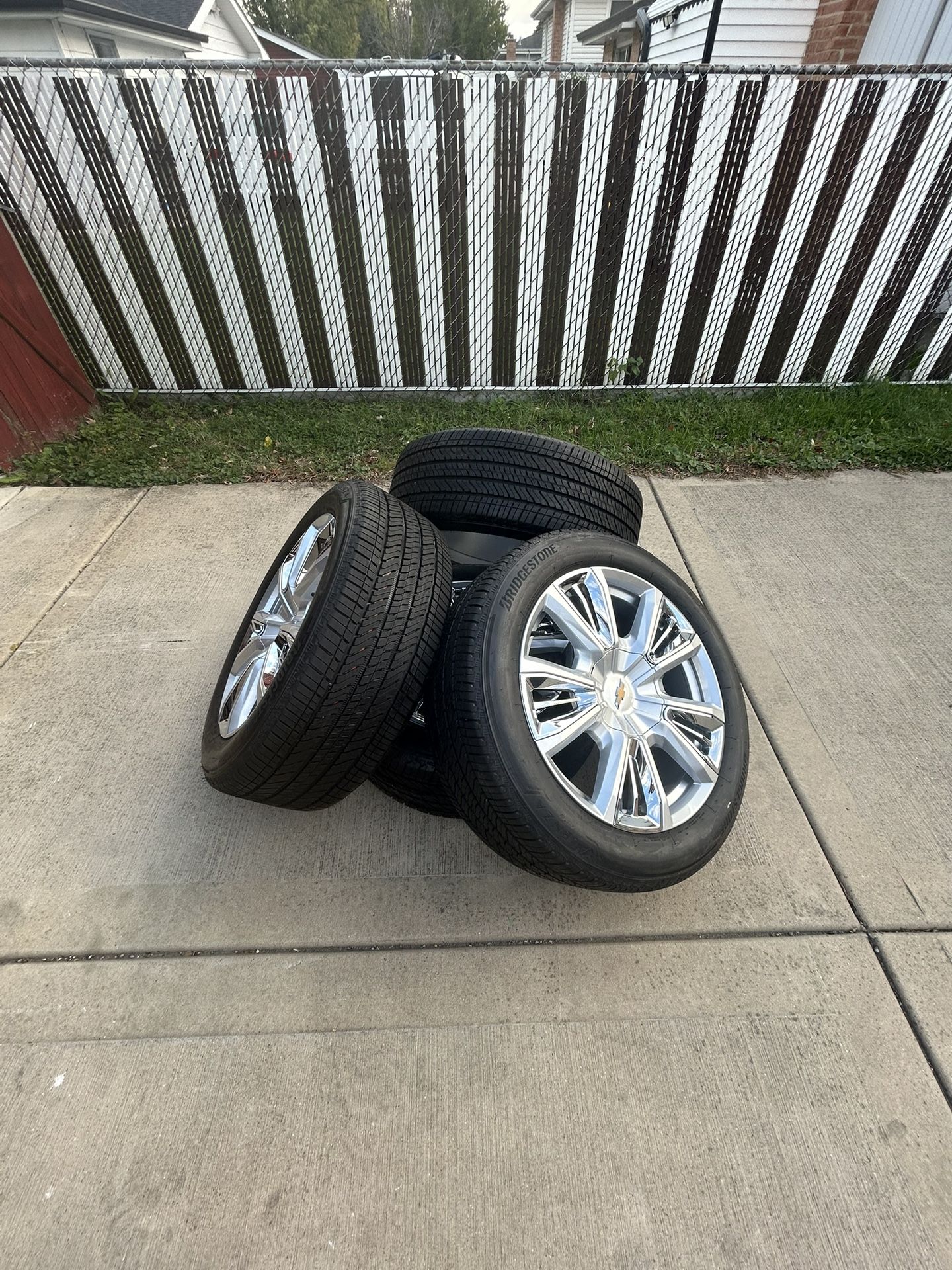 This listing is for a complete set of 4 OEM Chevrolet Chrome Wheels and Bridgestone Alenza A/S 02 Tires Wheel Brand: OEM Chevrolet Wheel Diameter and Width: 22x9.0J Wheel Offset: +28 mm (IS28) Wheel Bolt Pattern: 6x139.7 mm (6x5.5") Tire Brand / Model: Bridgestone Alenza A/S 02 Tire Size: 275/50R22 111H Tire Date Code: 2320 (manufactured in the 23rd week of 2020) Fitment: 2007–2024 Chevrolet Silverado, Tahoe, Suburban, Avalanche 2007–2024 GMC Sierra, Yukon, Yukon XL 2007–2024 Cadillac Escalade OEM Chevy Chrome Center Caps included. Ready to mount and balance.