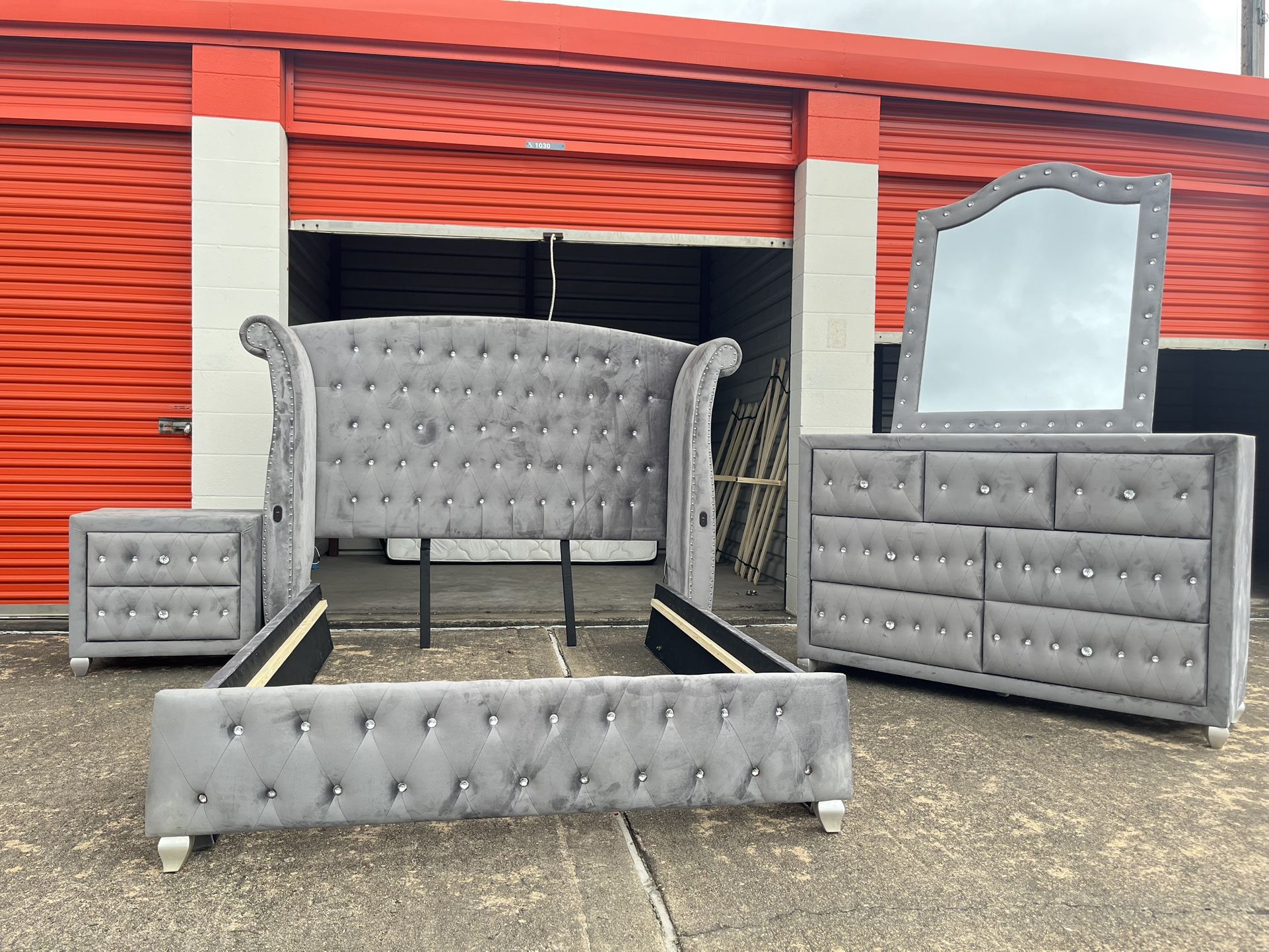 Queen bedframe with dresser, mirror, and nightstand Bed Frame has Bluetooth speakers and phone charging support