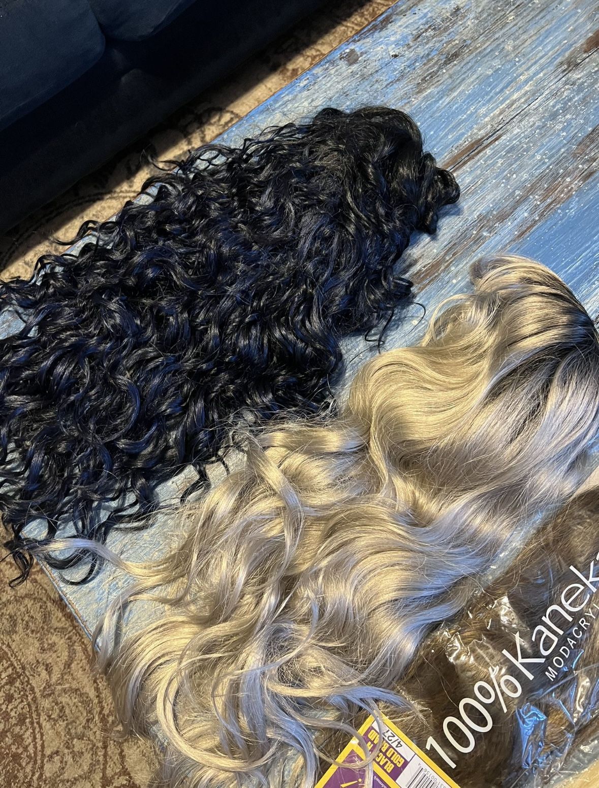 Black with blue highlights And platinum / silver-ish New!! Never used it! I think they are synthetic but I’m not 100% sure
