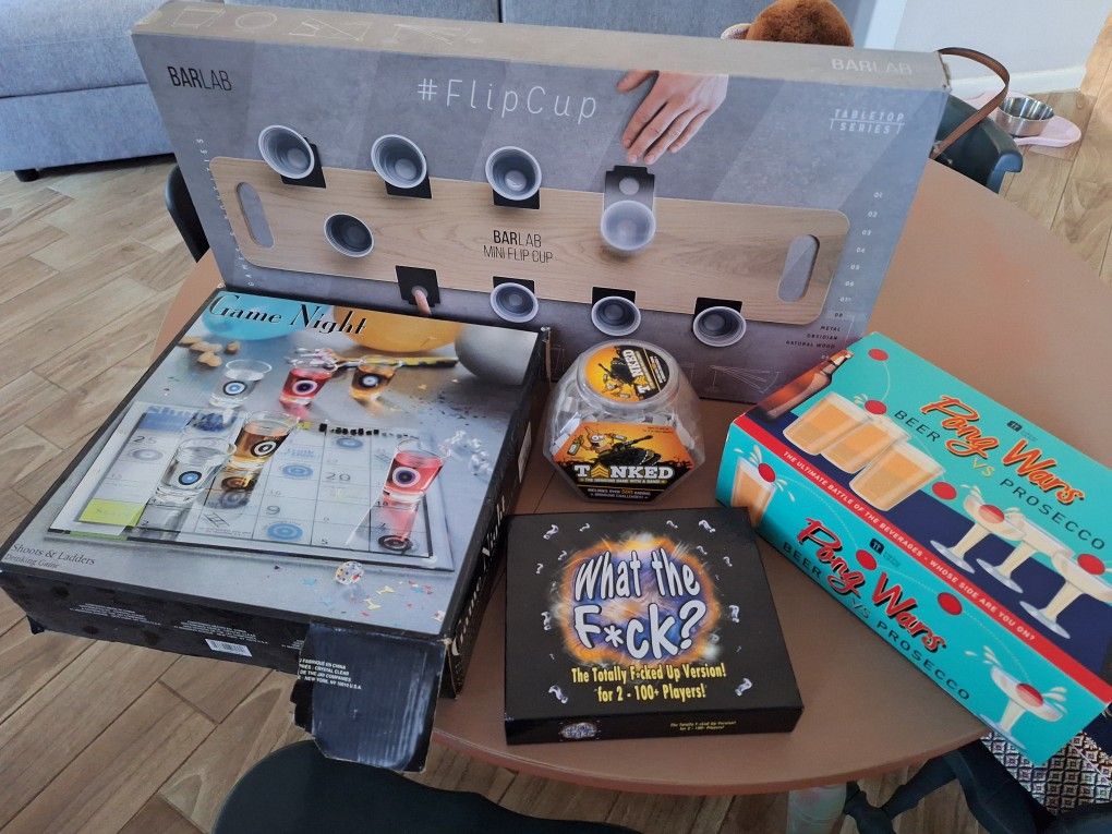I just dont need them anymore. Some of them have never been used. Drinking games, perfect for social gatherings. 5 games total. SHOOTS AND LADDERS FLIP CUP PONG WARS TANKED WHAT THE F*CK