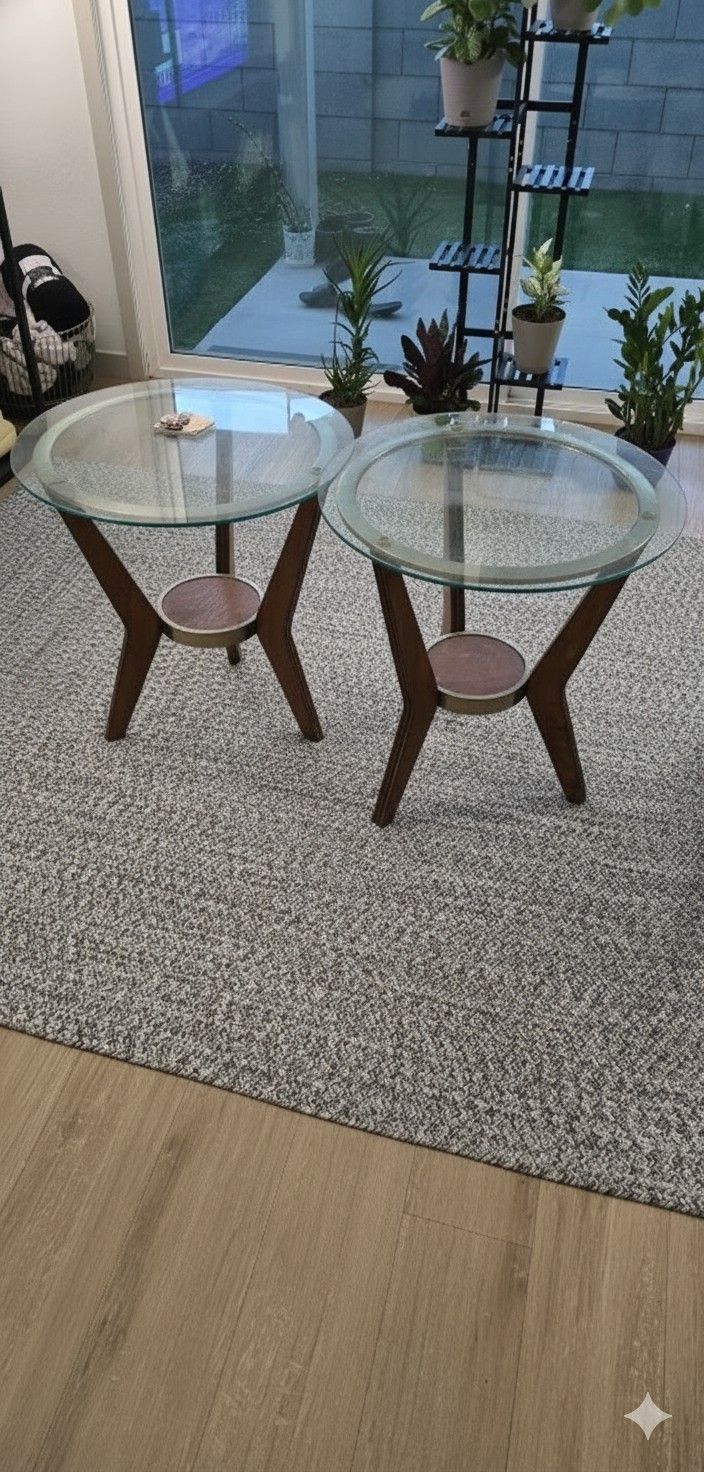 These "Vintage" end tables are in perfect shape, no damage to the wood or glass. They've got strong steel supports for the glass tops, and the cool wooden frame has a matching round shelf at the bottom. Great for a retro vibe in your living room! Price Listed OBO