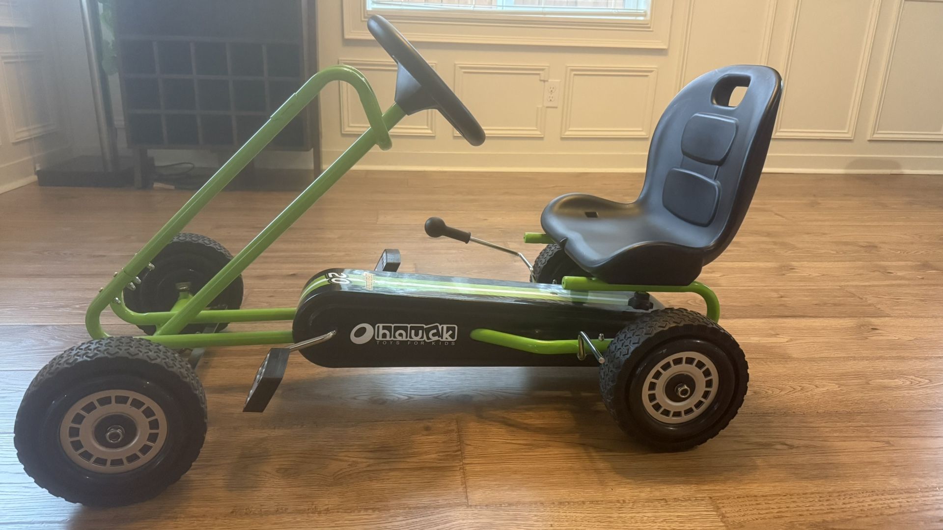 Almost like new HONEY JOY Go Kart for Kids, 4 Wheel Pedal Powered Go Cart with vSteering Wheels & Adjustable Seat, Safety Hand Brake, Non-Slip Tires, Outdoor Off-Road Racer Ride On Pedal Car for Boy Girl (Green) Great holiday gift idea!! • 🏁【Adjustable Bucket Seat】The go kart for kids comes with ergonomic seat to designed to give your child a more comfortable ride. The seat with the high bucket has 2 adjustment positions to suit the different needs of the rider to relieve back muscle fatigue. • 🏁【Easy to Operate】This pedal go kart demands a less complex method and what the child needs to do is to force the pedal to move forward or backward and control the steering wheel to change direction. Easy operation makes the go cart a wonderful character as an appropriate present for boys and girls. • 🏁【High-Safety Construction】Constructed of a metal frame and plastic, this ride on pedal car is sturdy enough for kids aged 3+ to ride indoors or outdoors to enjoy their happiness. Maximum weight capacity: 66 lbs. • 🏁【Non-slip Wheels】Equipped with 4 premium wheels with anti-slip strips, this kids ride on pedal car is wear-resistant and can be driven on different roads, such as asphalt roads, cement roads and boardwalks to ensure its stability. • 🏁【Perfect Gift for Children】Our peddle go kart encourages the children to drive and control the speed by themselves, so that the children can feel the driving pleasure, and can enhance their strength, endurance and coordination.