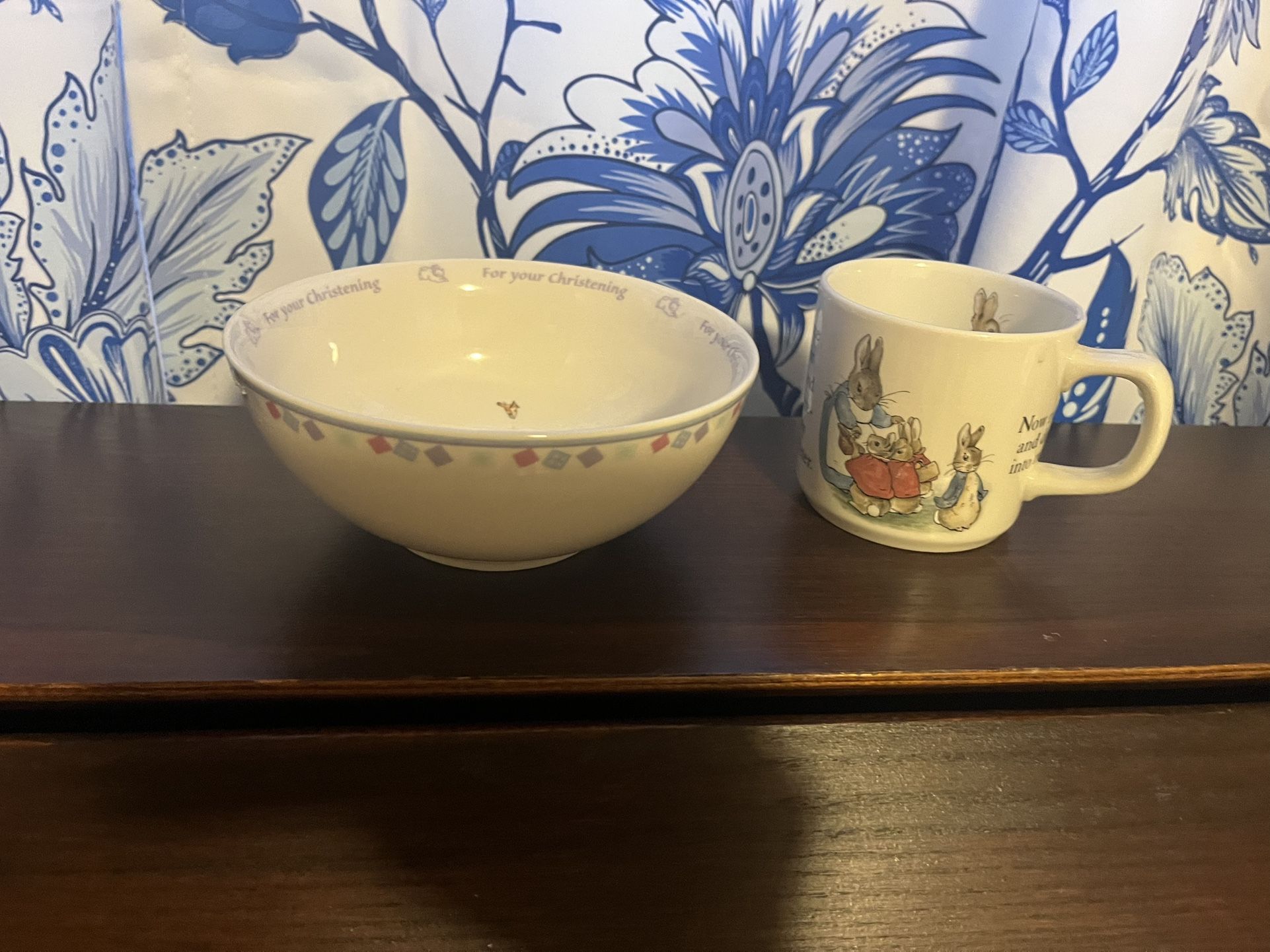 Brand new Wedgwood Peter Rabbit cup and bowl set. The bowl has a Peter Rabbit design on the inside. The cup has text and a Peter Rabbit image on the outside. Never used.