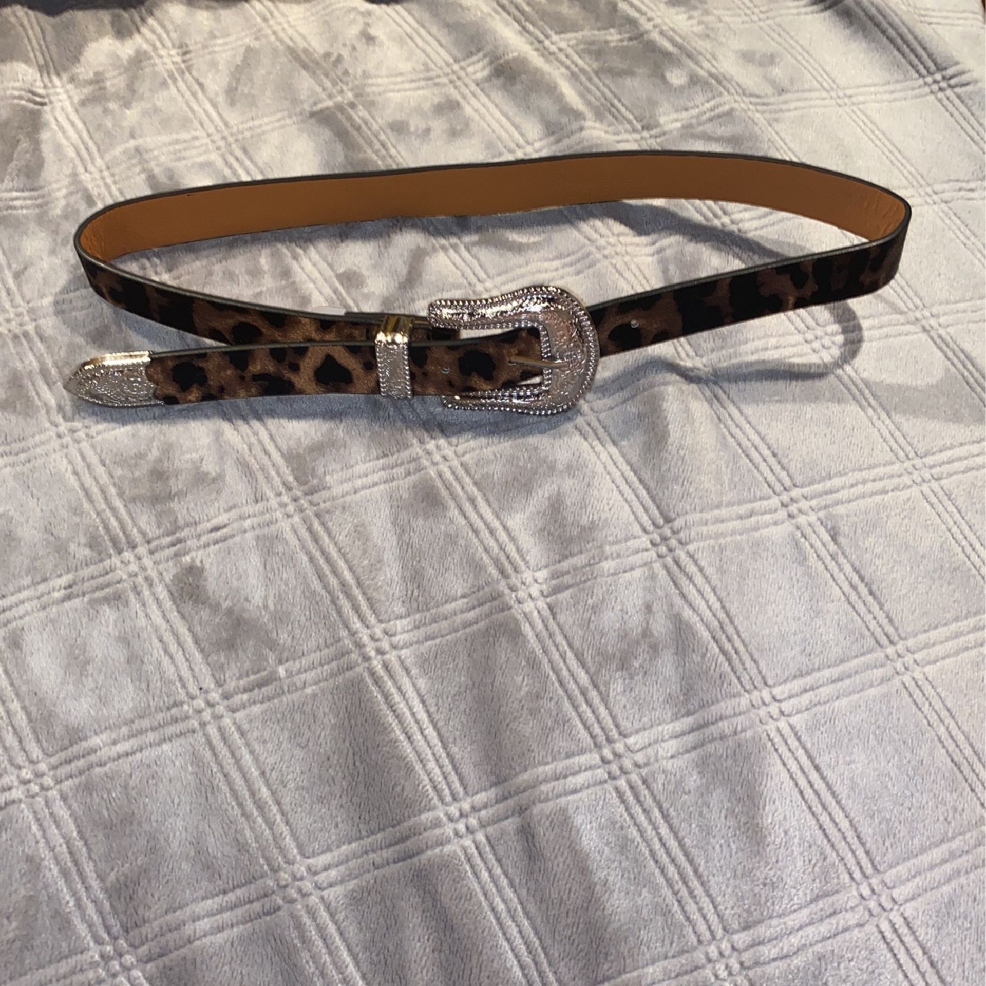 Cute size 5 Cheetah print belt with silver accents! It would go great with some jeans, a skirt, or even a little black dress.