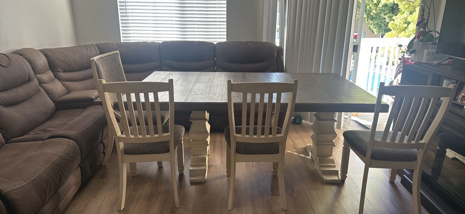 Beautiful Used Family Dining Table – Extends Out Well-loved family dining table with extension, perfect for gatherings and holiday meals. Table and chairs are real wood and in good, fair condition. 8 chairs included. There is very minor paint on the tabletop from kids’ coloring, but nothing that affects use or appearance. Overall, it’s sturdy, functional, and ready for many more family memories—perfect for a Christmas gathering. Selling as-is. Price is negotiable for serious buyers only, please. I apologize for the inconvenience, but I don’t have the dimensions if you have a house or condo it will fit! My place is an apartment and it fit fine. Video of table upon request feel free to come check it out in person. SERIOUS INQUIRIES ONLY. If you say you’re coming please don’t waste my time. Thanks in advance Leaf for the extension included