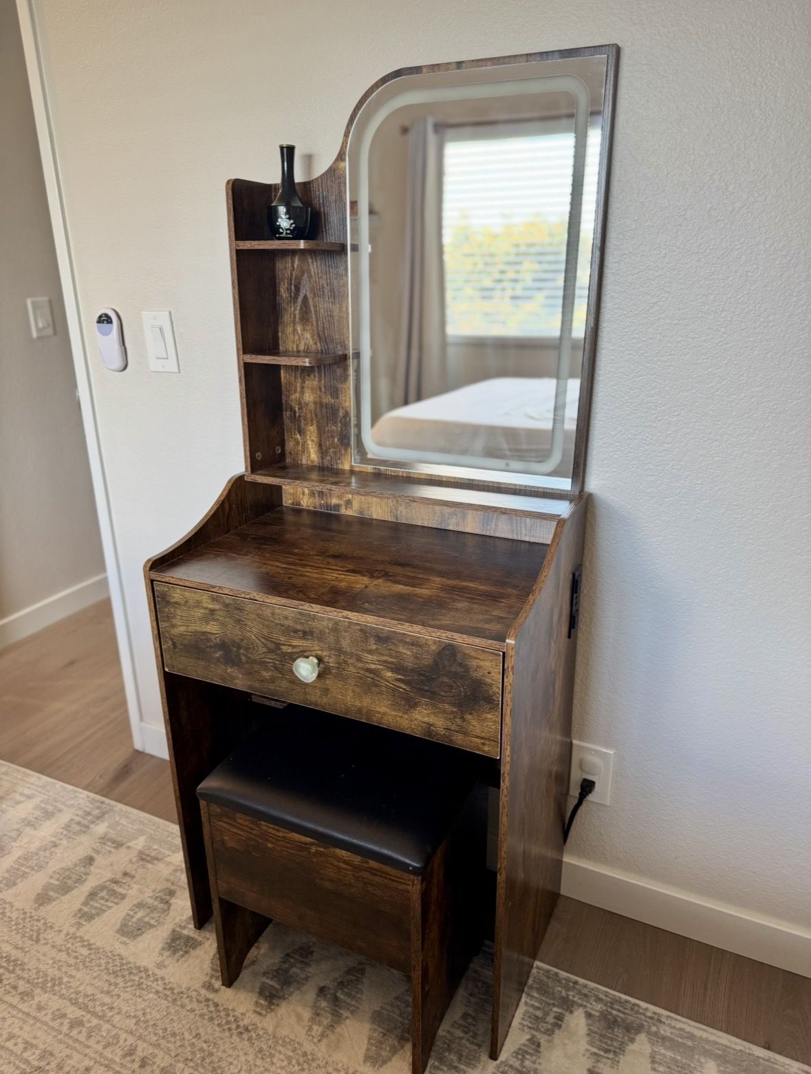 Price: $140 Beautiful rustic/farmhouse style makeup vanity in excellent condition — perfect for small spaces, apartments, or bedrooms. ✨ Features: • LED mirror with 3 light modes: • Cold White • Warm White • Warm Yellow • Dimmable brightness (touch control) • Built-in side shelving for makeup or decor • Spacious drawer for storage • Matching flip-top storage stool (hidden compartment) • Compact footprint — great for smaller rooms 📏 Dimensions: • Height: 59.5” • Width: 24.5” • Depth: 15” 🪵 Finish: Rustic dark wood / farmhouse style Condition: Very good — clean and sturdy. Smoke-free home. 💡 Great for makeup, skincare, or as a small vanity desk. Pickup: Pickup in Anaheim Hills. Delivery available but would be firm on price.
