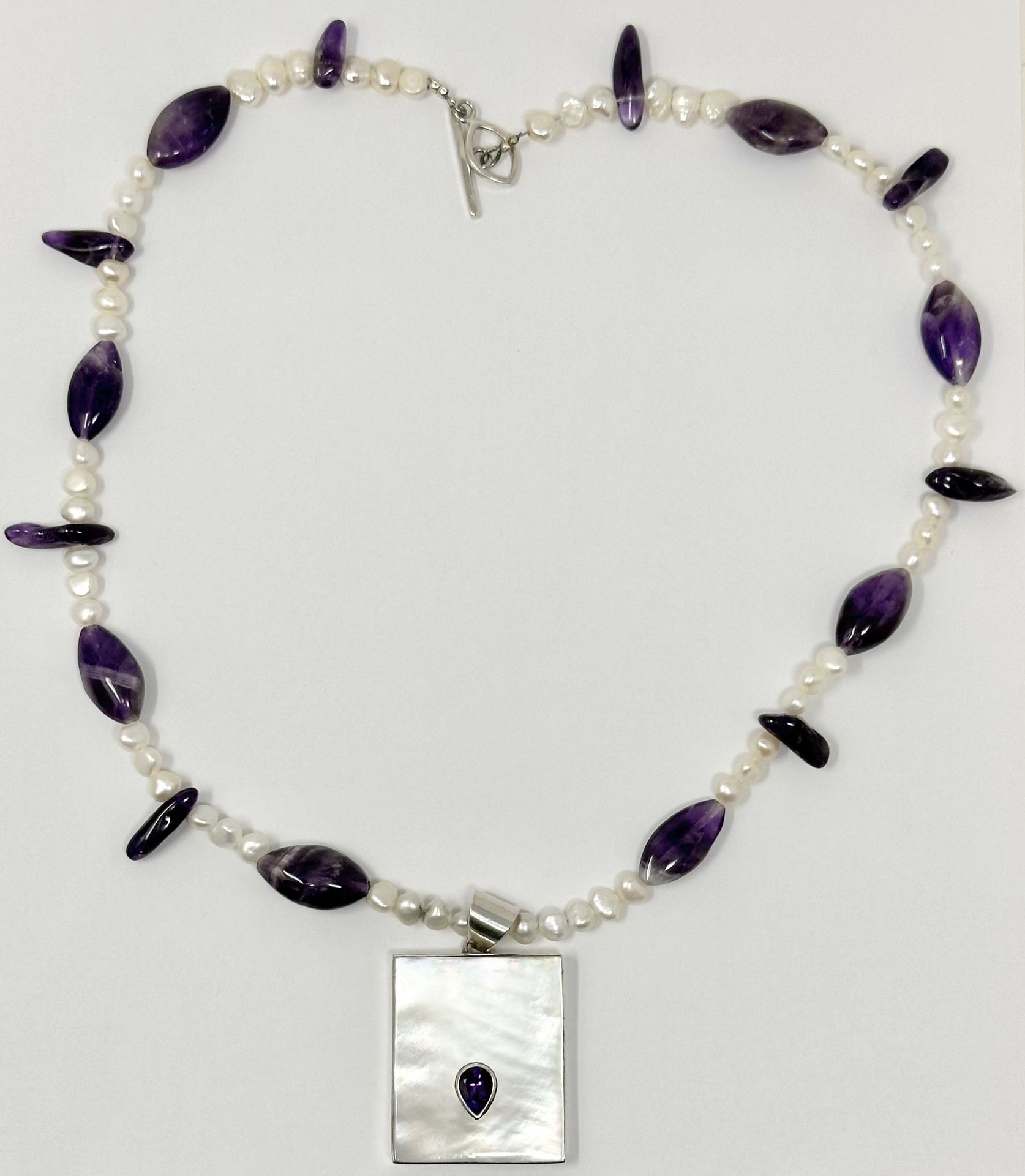 925 Silver Freshwater Pearl, Amethyst + Mother of Pearl 24" Pendant Necklace