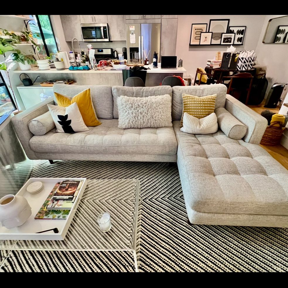 Comfortable and stylish sectional sofa with tufted design and mid century wooden legs. I got this from Article 5 years ago (for $2500) and it’s in great condition overall from regular use. It has a small hole on the side of the couch, about the size of a pencil eraser but you don’t see it because it’s towards the back. Located in highland park. You pick up. It comes apart into sections and all cushions are removable.