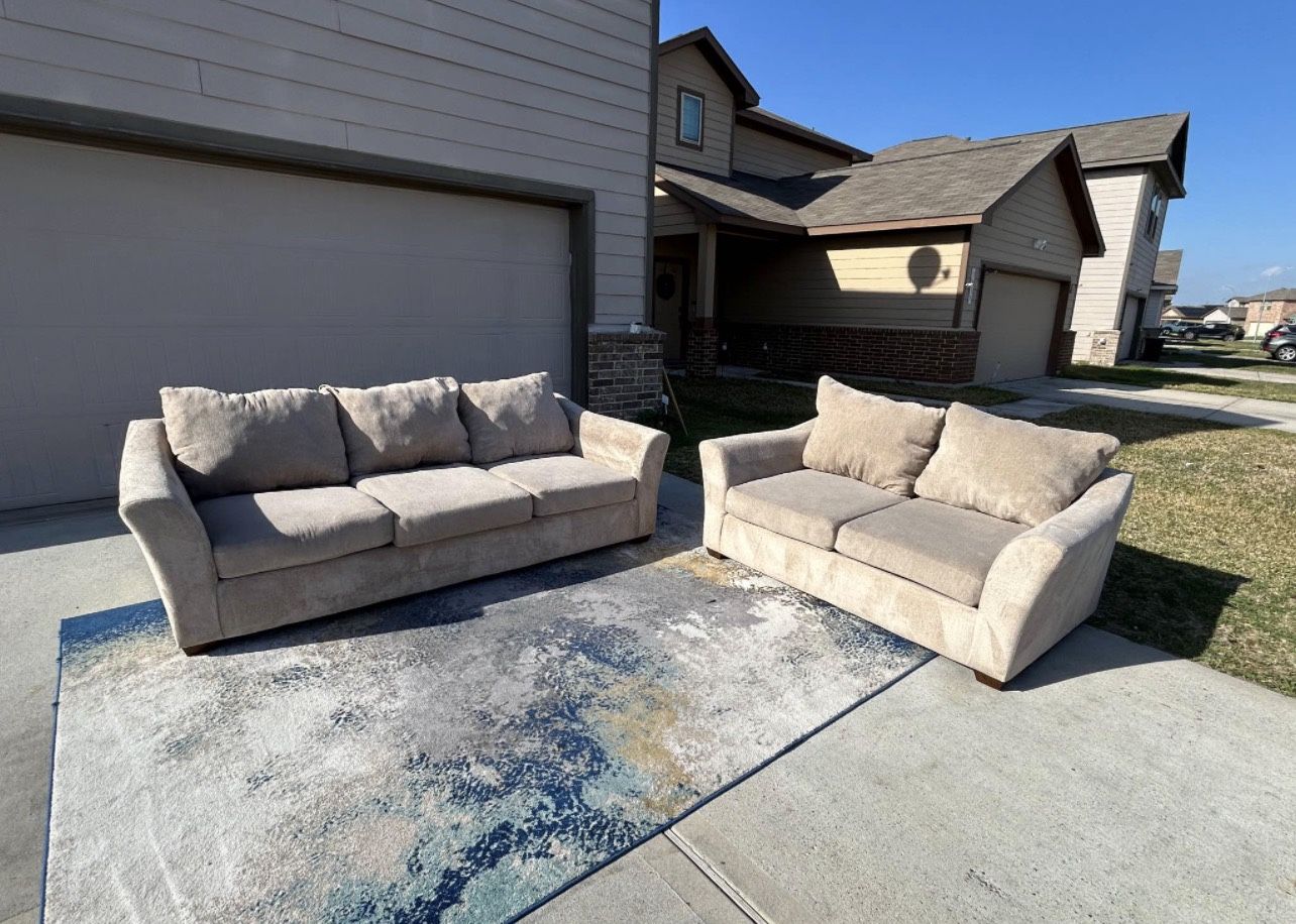 Selling a matching sofa and loveseat set This set features a clean, transitional design that fits perfectly with any home decor. We also offer delivery for an extra cost Vendo un juego de sofá y sofá de dos plazas a juego. Este conjunto cuenta con un diseño limpio y de transición que encaja perfectamente con cualquier decoración del hogar. También ofrecemos entrega por un costo adicional