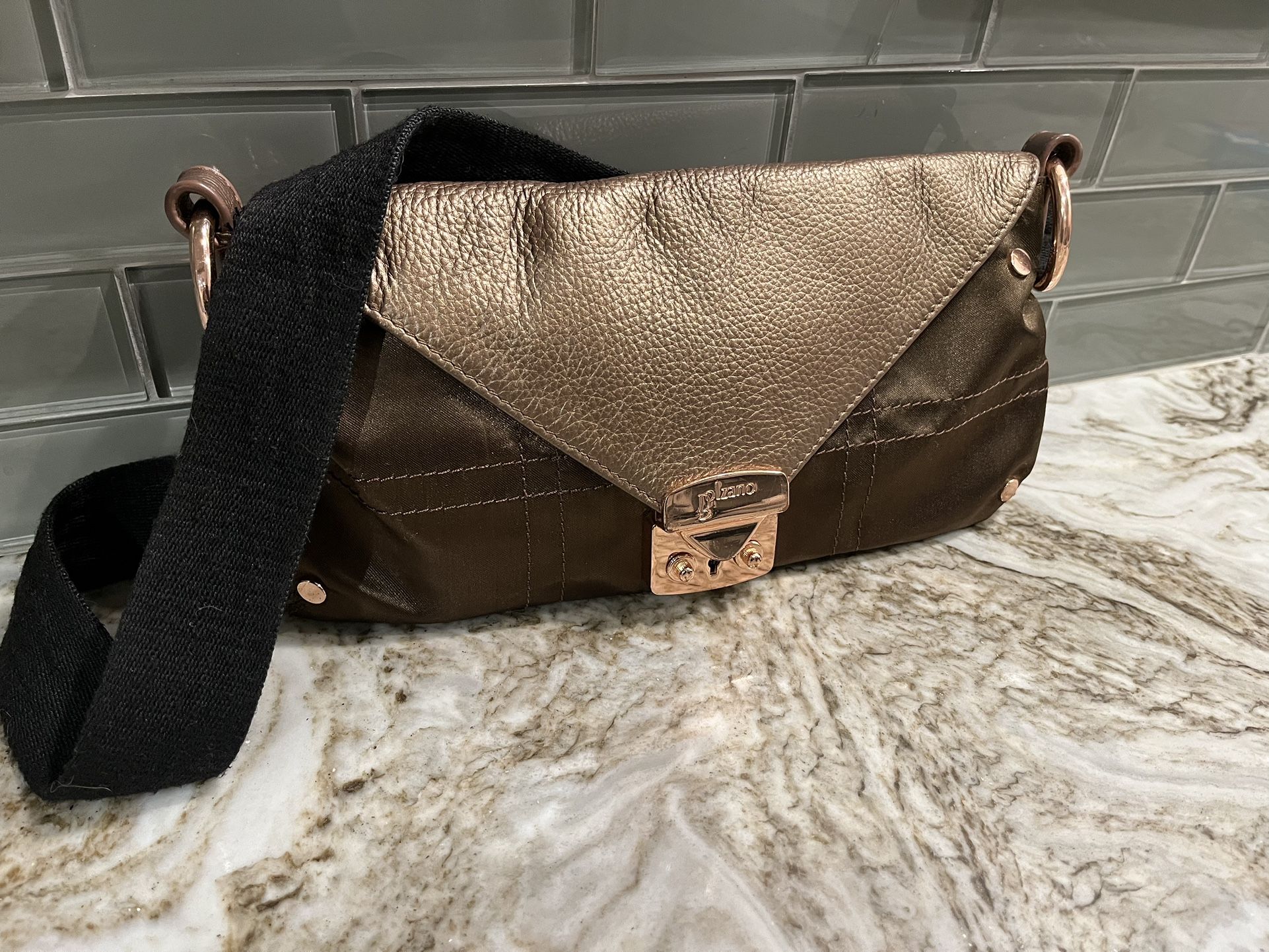 Bolzano handbag that hasn’t been used. Satin sheen handbag in brown tone with pebbled leather cowhide flap front. Rose gold hardware, rings for shoulder strap and front clasp. Black knit shoulder strap with a 14.5” drop. Inside of bag is lined with designer name, zip pocket and two pockets. Strap rings have designer name imprinted. Front clasp pushes in to open. Missing the key so I’m pricing discounted. Bag stays closed just can’t lock. Measures approximately 12” by 6.5”.