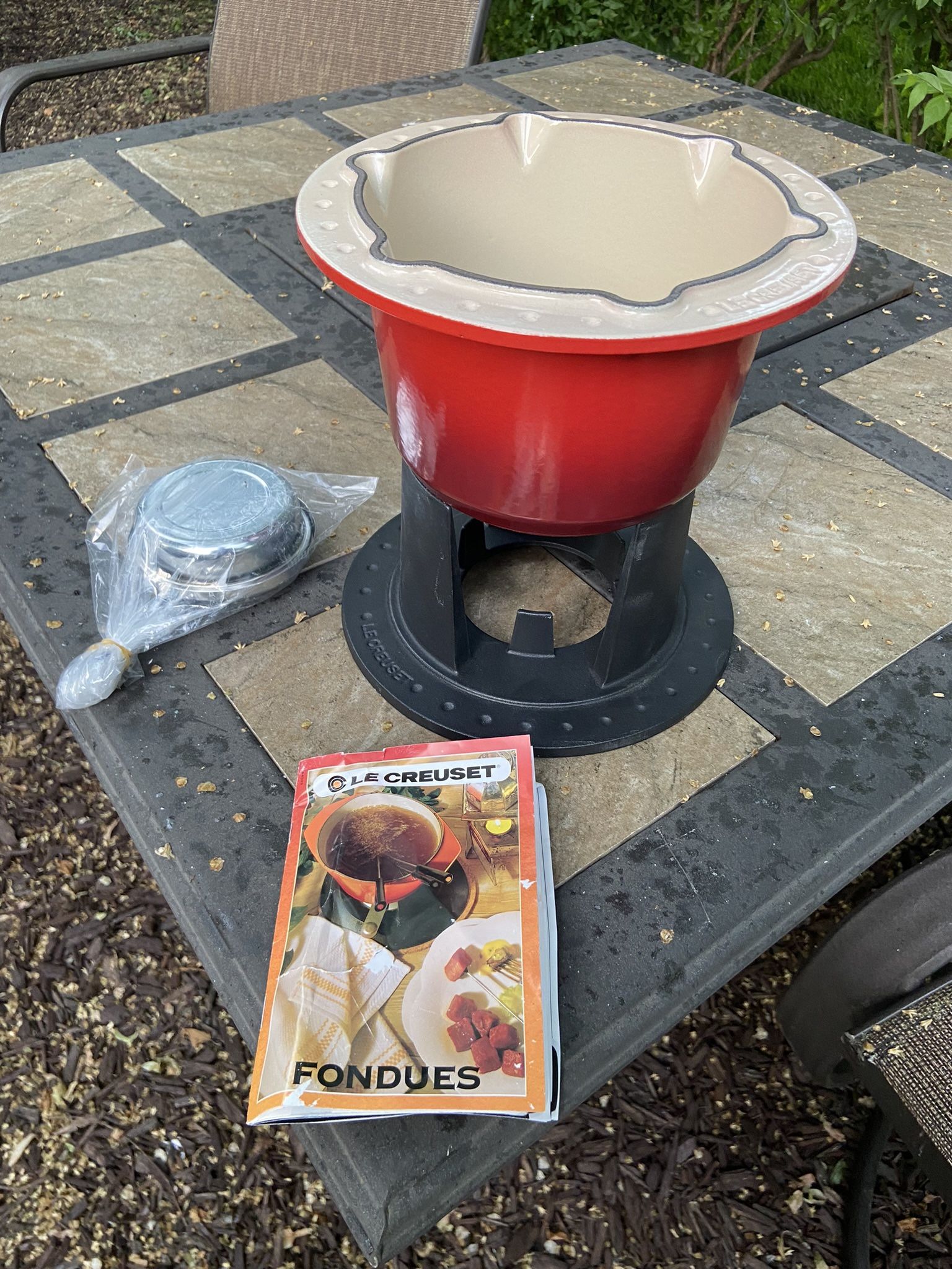 LE CREUSET Cerise Red Compact Table Top Fondue Set Enameled Cast Iron Base