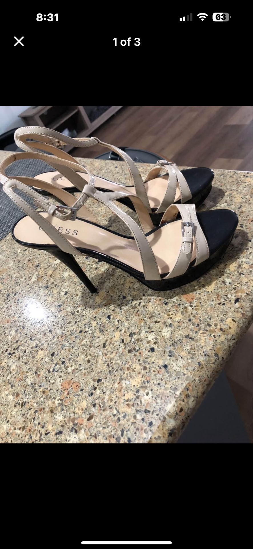 Tan and black strappy stiletto’s, Size 8.5 M, 4” heel Worn once