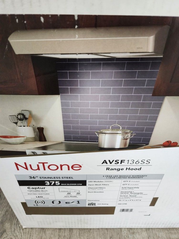 BRAND NEW NUTONE RANGE HOOD. MODEL AVSF136SS . IGNORE: MICROWAVE. KITCHEN. APPLIANCES. LOCATION: 4267 MARKET ST. RIVERSIDE. 92501