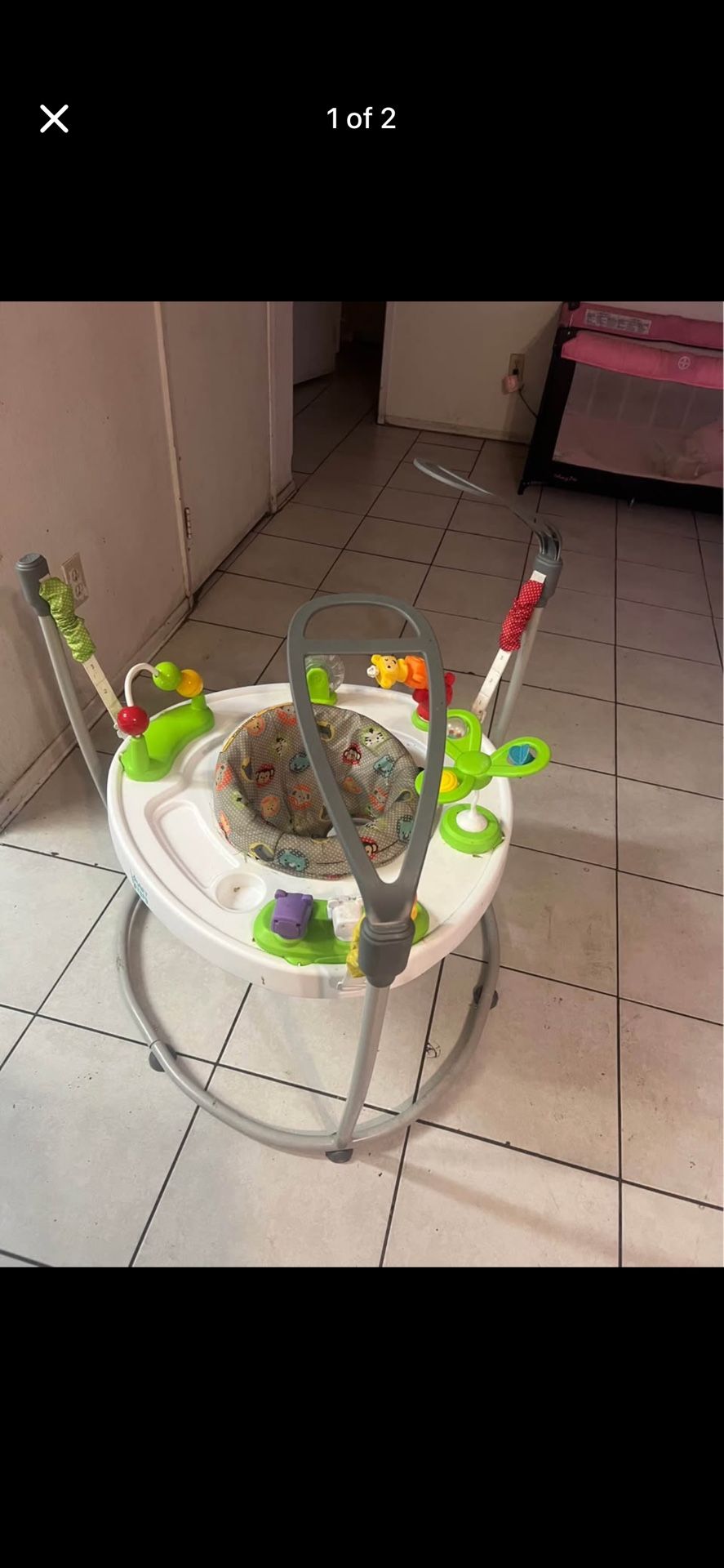 Interactive baby activity jumper. Has lots of colorful toys for little one to play with. Baby can bounce and spin around. Good for keeping them entertained!
