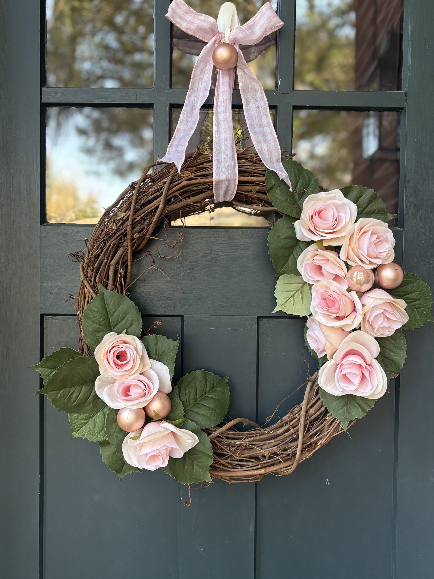 An elegant spring or summer wreath with light pink roses, full of gentle color and natural charm.