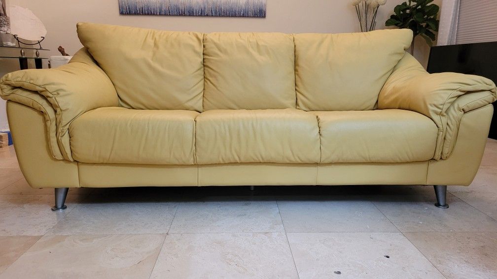 Natuzzi leather sofa, no stains or damage, very comfortable, steal angled legs. Very nice. Seats 3 normal size adults and 4 thin adults.