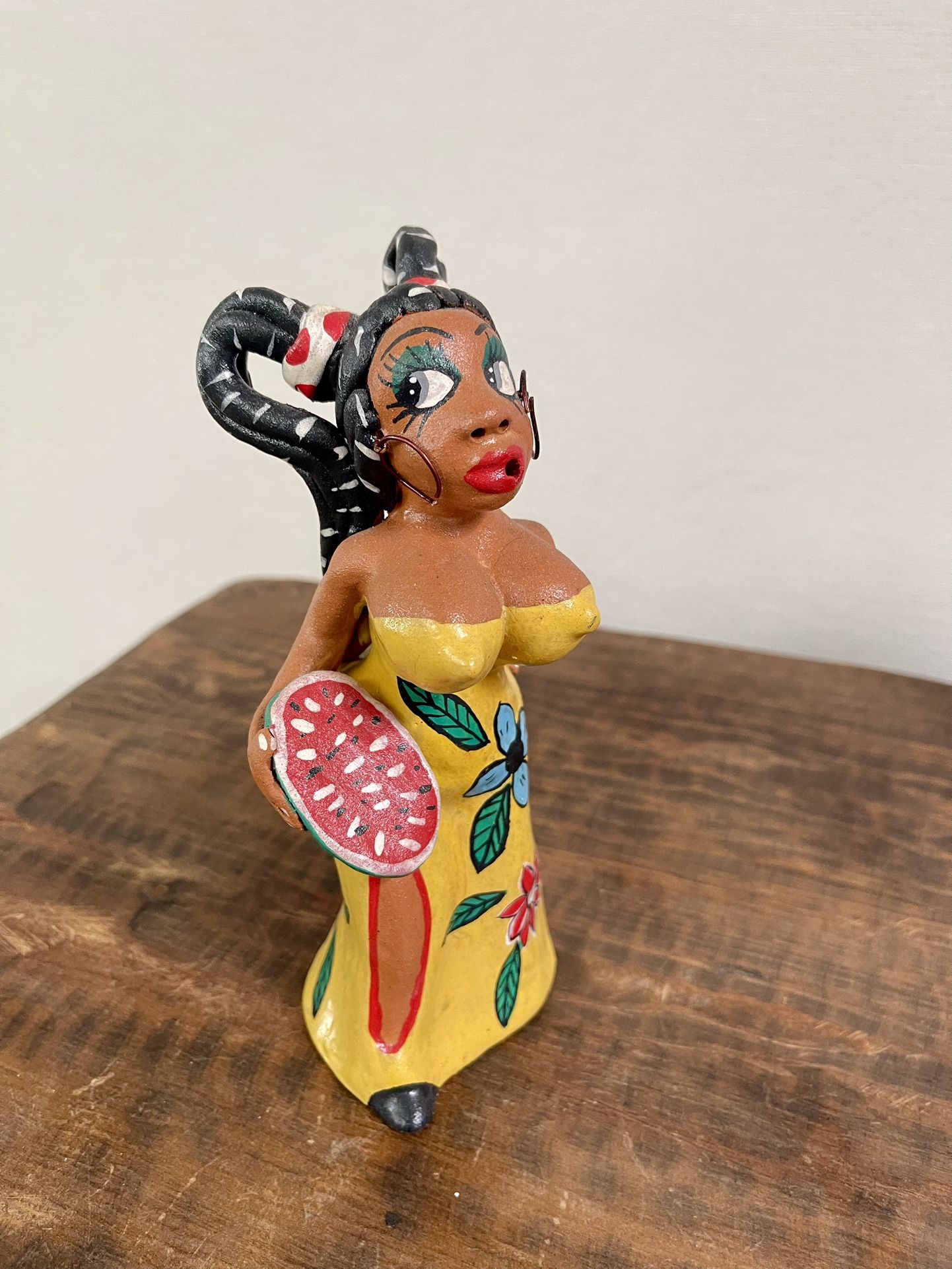 Cuban terracotta statuette woman with metal earrings. Yellow dress. 8” tall. Purchased in Havana