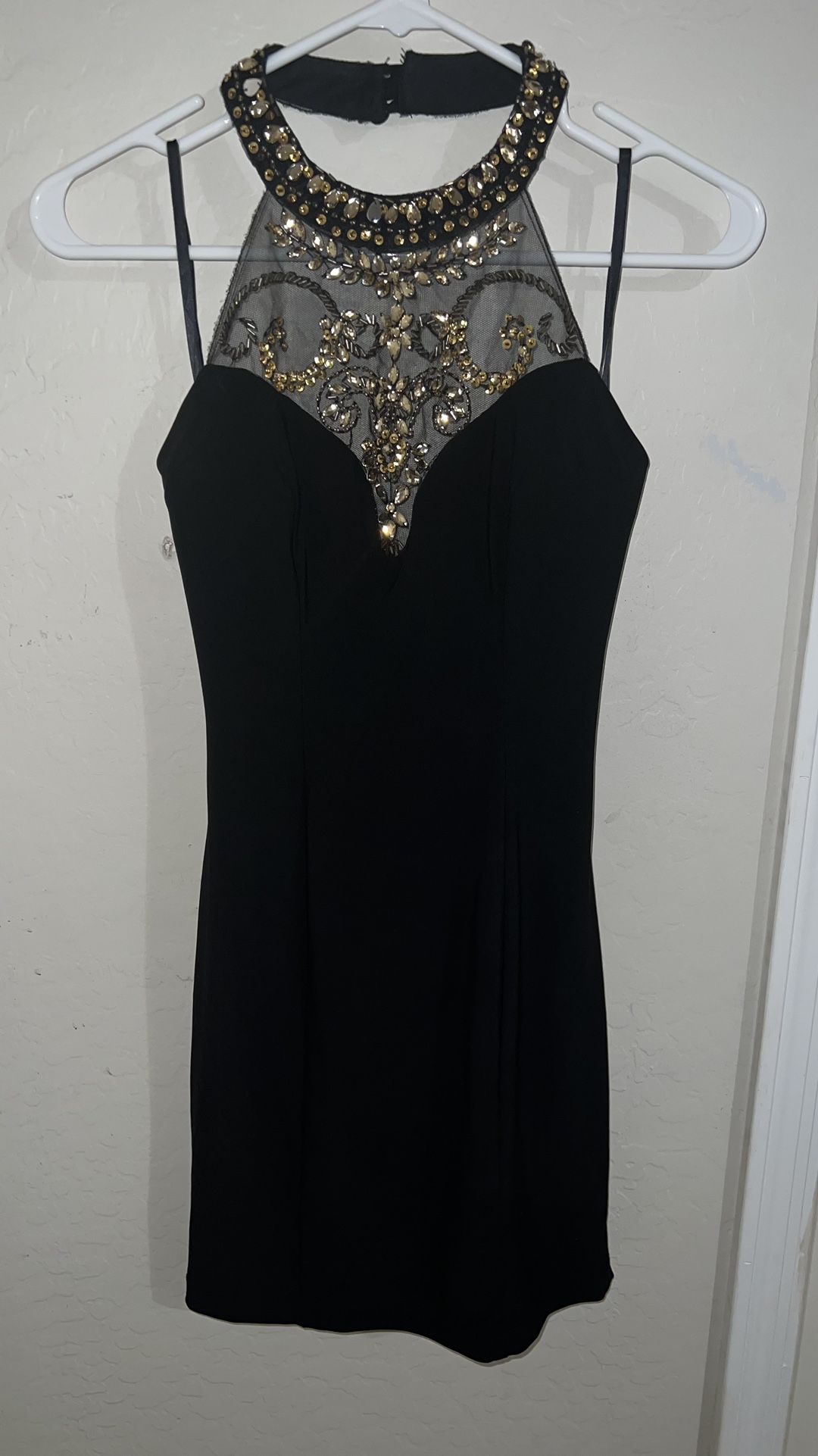 Gold jewels around the chest and neck. Sheer on the chest. Black dress. One hook on back with two straps. Two button neck tie. Worn once.