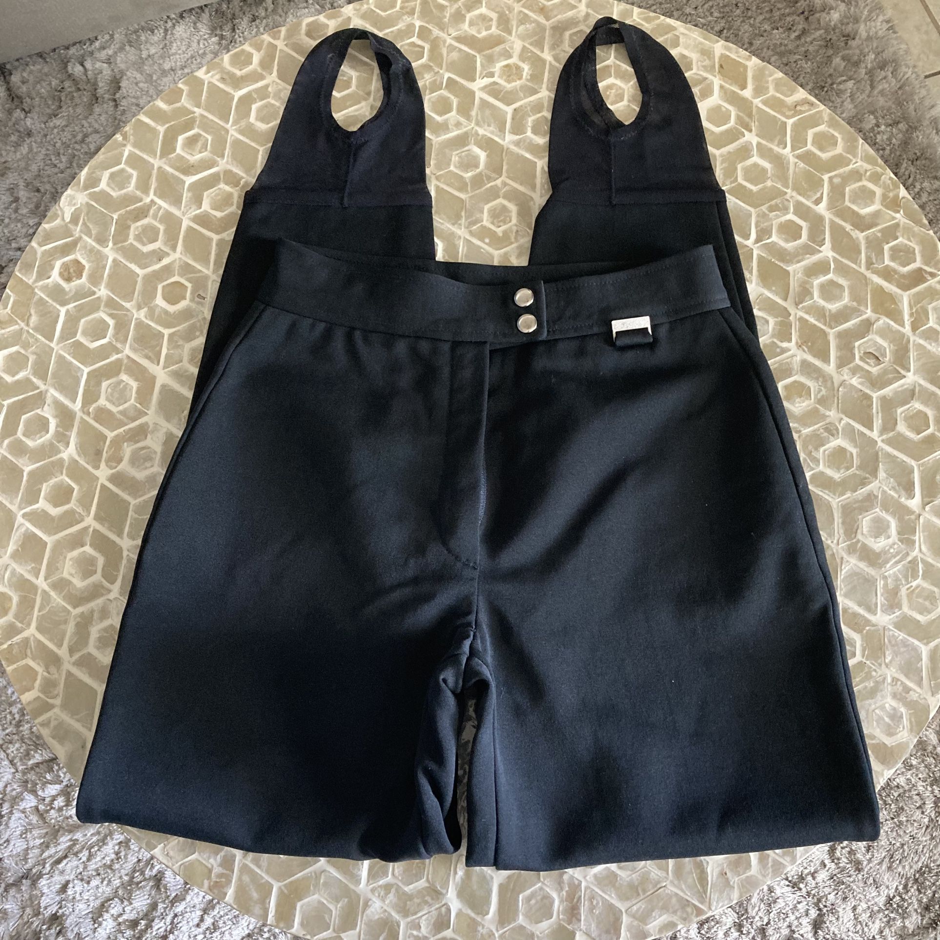 Vintage black ski pants with stirrups to keep pants tucked into your boots. Wide banded waist with zipper fly and double snap closure. Excellent vintage condition! label: Edelweiss Skiwear fabric: 63% nylon, 15% wool, 18% rayon & 4% elastan. size: labeled size is 10, however, modern size is smaller. Black High Waist Stretch Knit Size 10. Waist measures 14” lying flat with a 12” rise & length to end of stirrup is 31”.