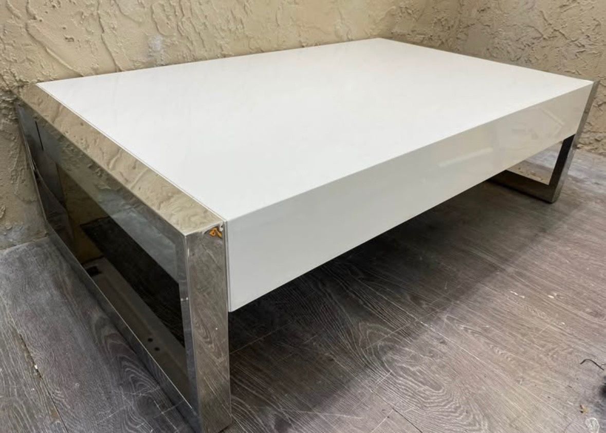 VIDEO AVAILABLE SO YOU CAN VERIFY THE CONDITION Sleek coffee table. White glossy top with chrome frame. Has one pull-out drawer for storage. Good for living room. H 14 W 47 1/4 D 27 1/2 Local Delivery Available for a Fee SEE MY OTHER ITEMS ๐