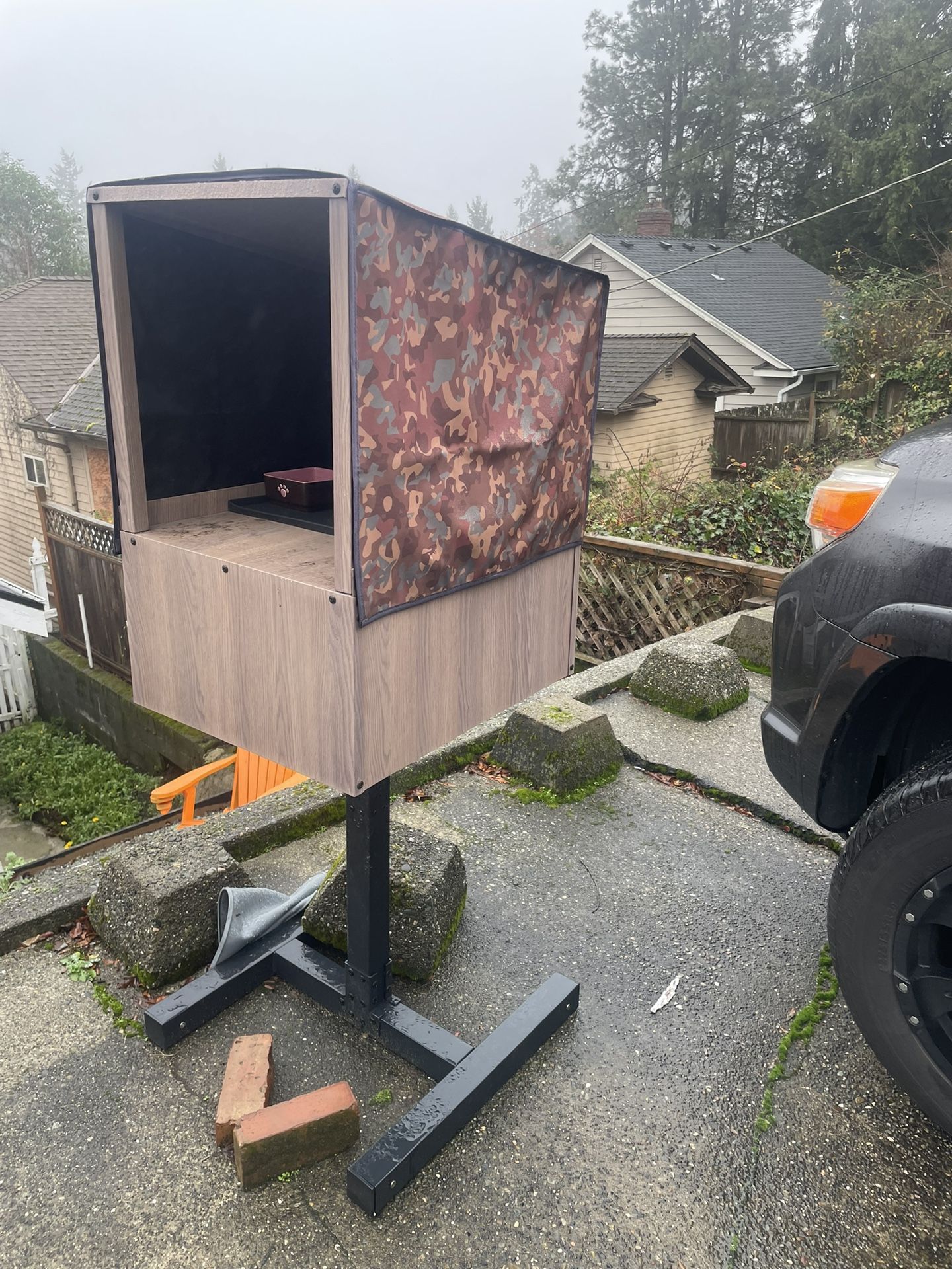 Raccoon proof cat house, works great. Cats get what they need and the raccoons can't get the food.