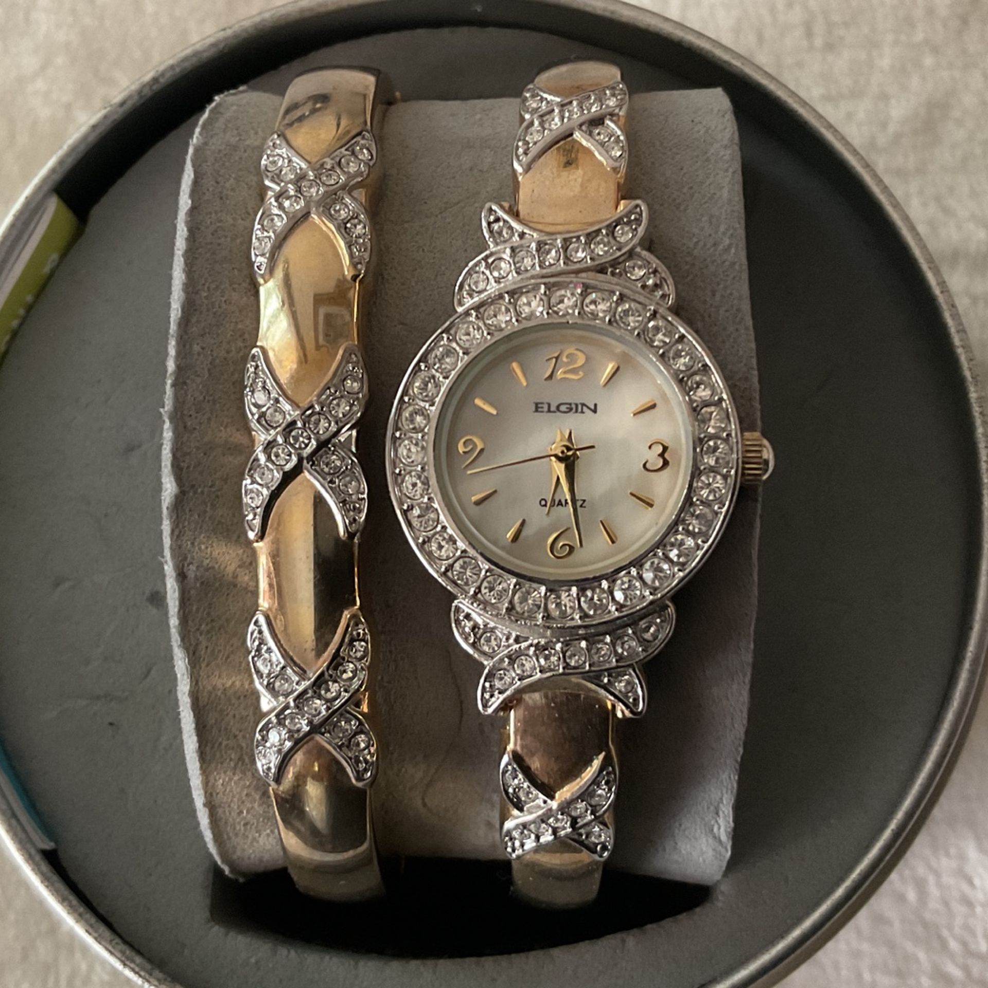 Gold And Silver ELGIN Hugs Bangle Watch And Matching Bracelet,both With Rhinestones …by ELGIN
