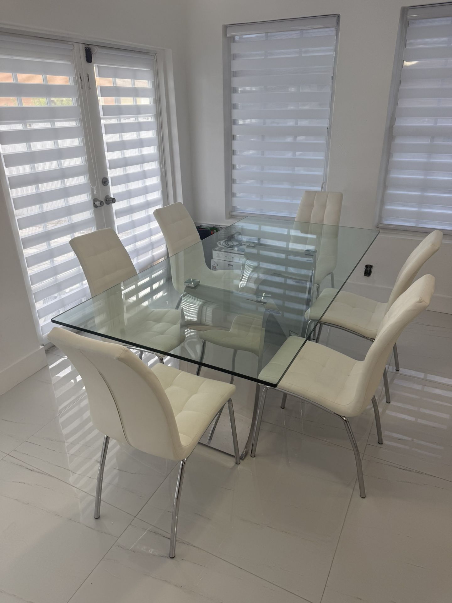 Large glass and stainless steel table measuring 79 L x 39 W inches, with 6 white leather chairs, all like new, rarely used.