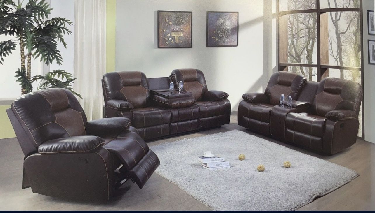 Brand new still in packaging this is display picture with cup holders and storage Sofa and love seat and chair all included Delivery to all areas