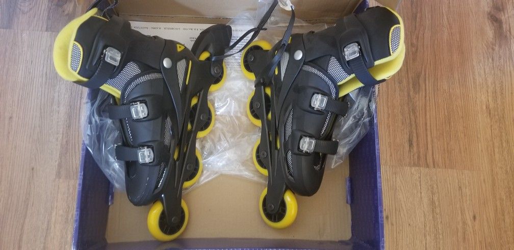 These are brand new still in the box Roller Derby roller blades. Adjustable size fits sizes 6 to 9.