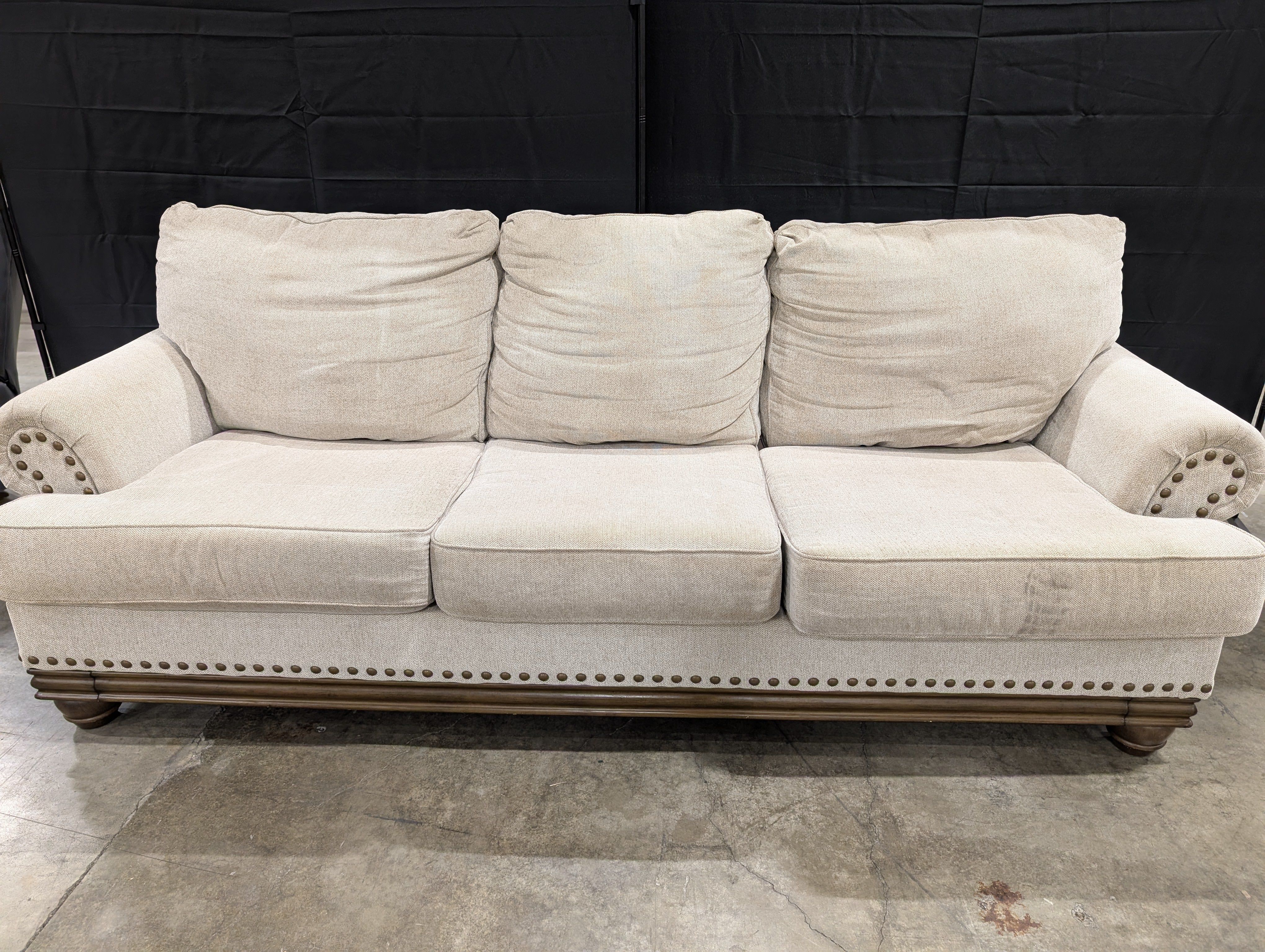 This is a three-cushion sofa upholstered in a light beige textured fabric. It features three back cushions and three seat cushions. The base of the sofa is covered with a black fabric underneath the seat cushions.