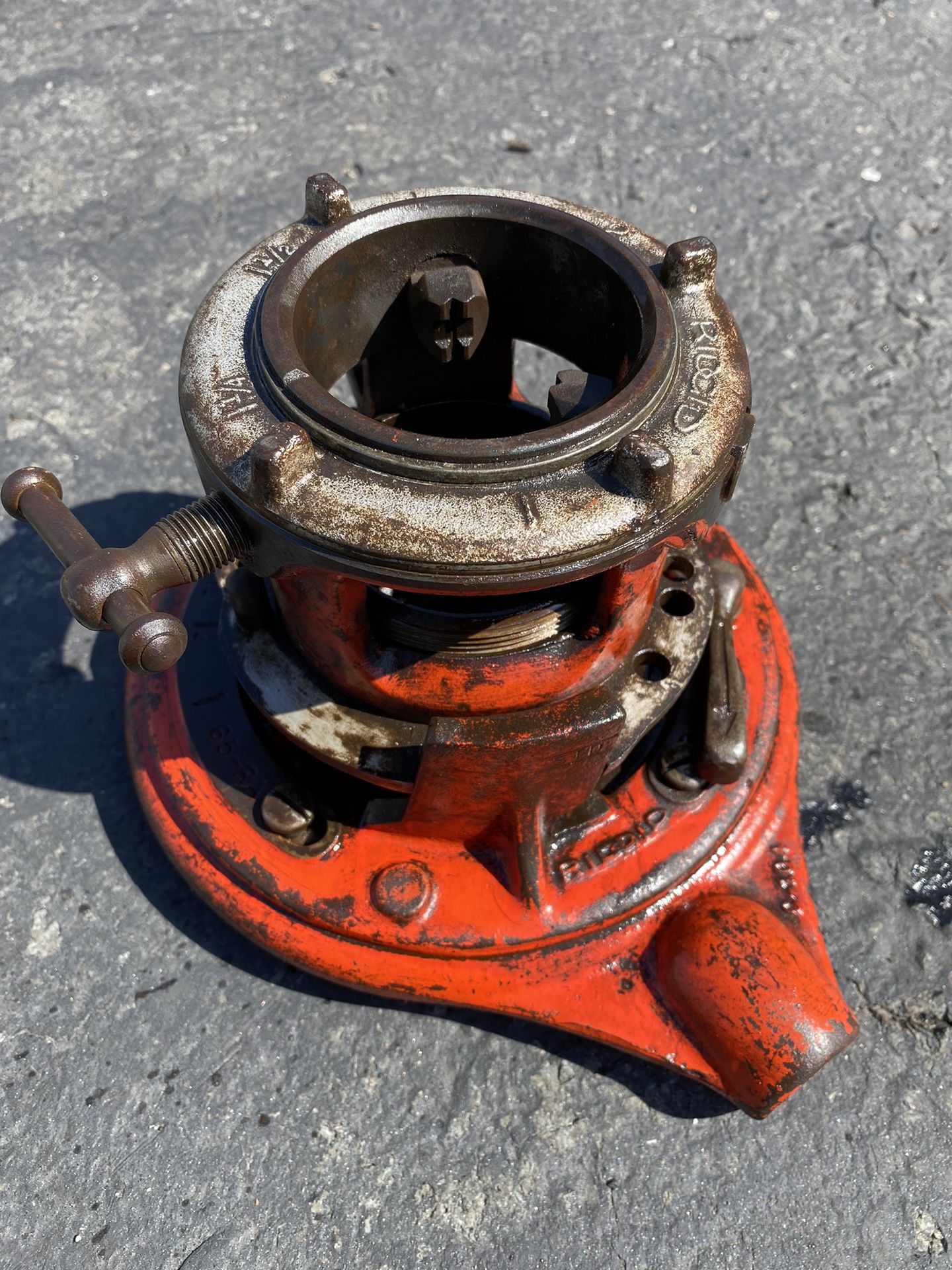 Rigid pipe threader for 1” , 1-1/4”, 1-1/2”, 2” pipe threads, it’s a receding threader, which means as the head is turned it advances in toward the pipe, feeding the threader into the pipe, eliminating the fight to start the thread.