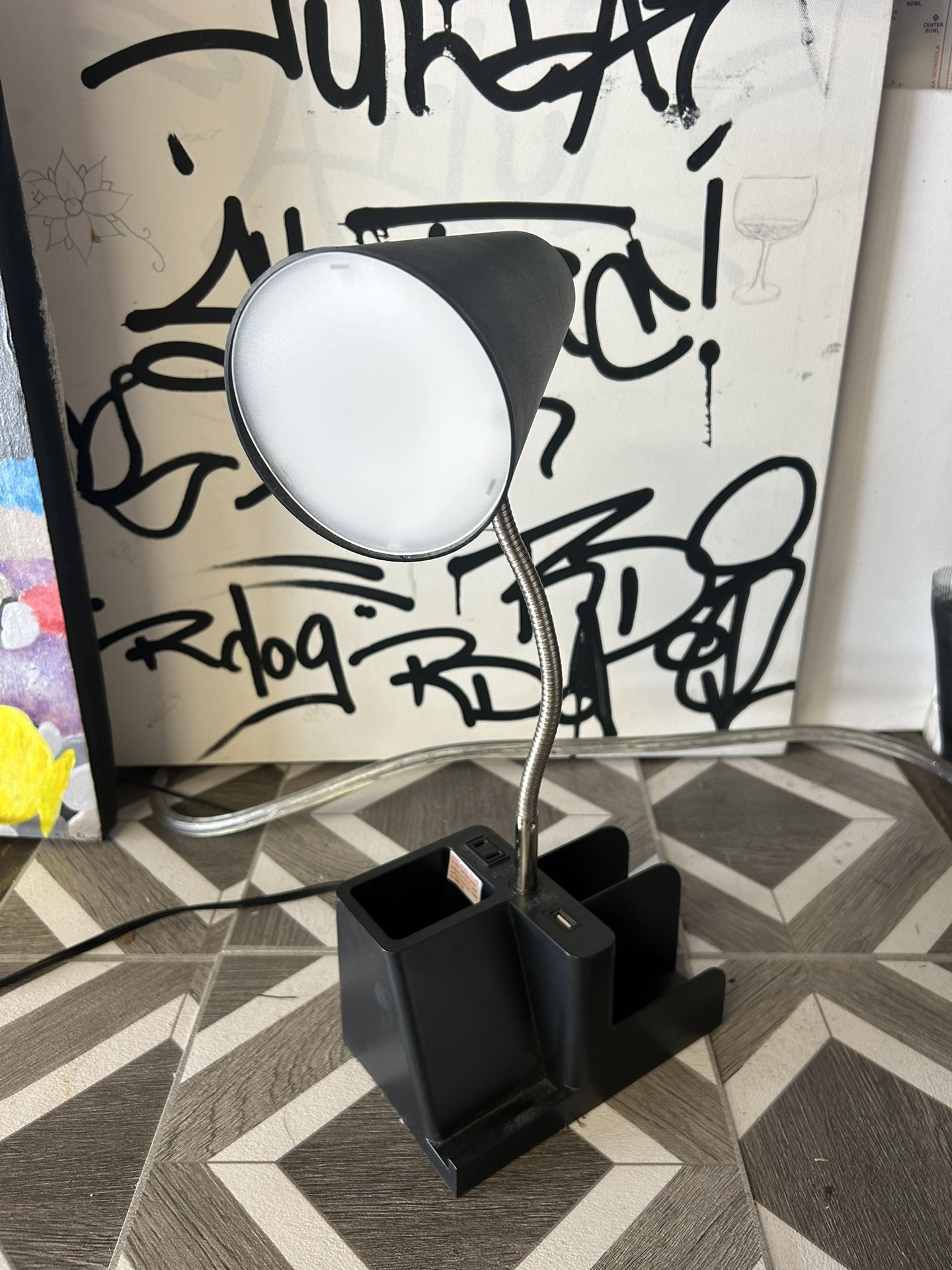 Has USB and normal plug with Phone holder and dividers. Light and plugs work