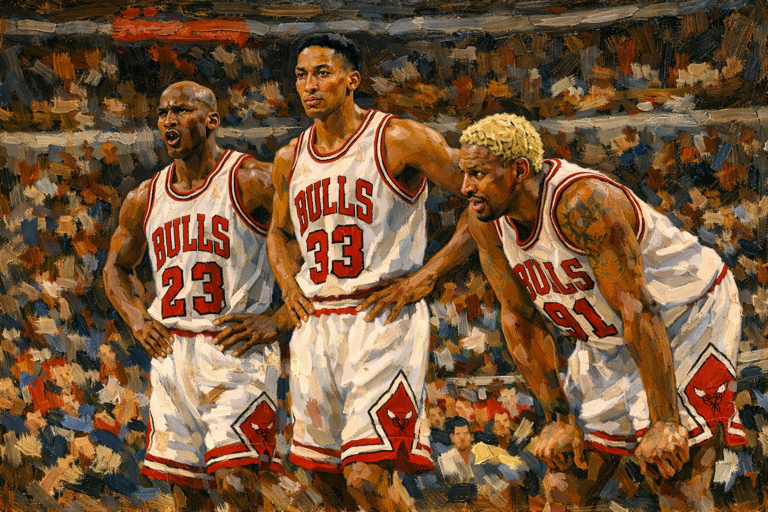13x19 oil painting print of Jordan, pippin, and Rodman.