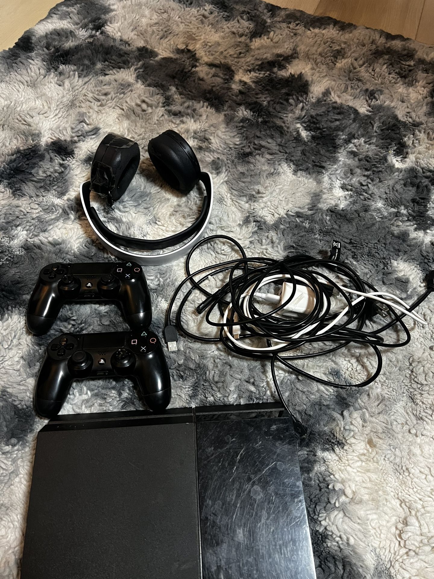 PS4 - comes with 2 controllers 1 head set with usb and charger Charger for the two controllers HDMI cord AC cord