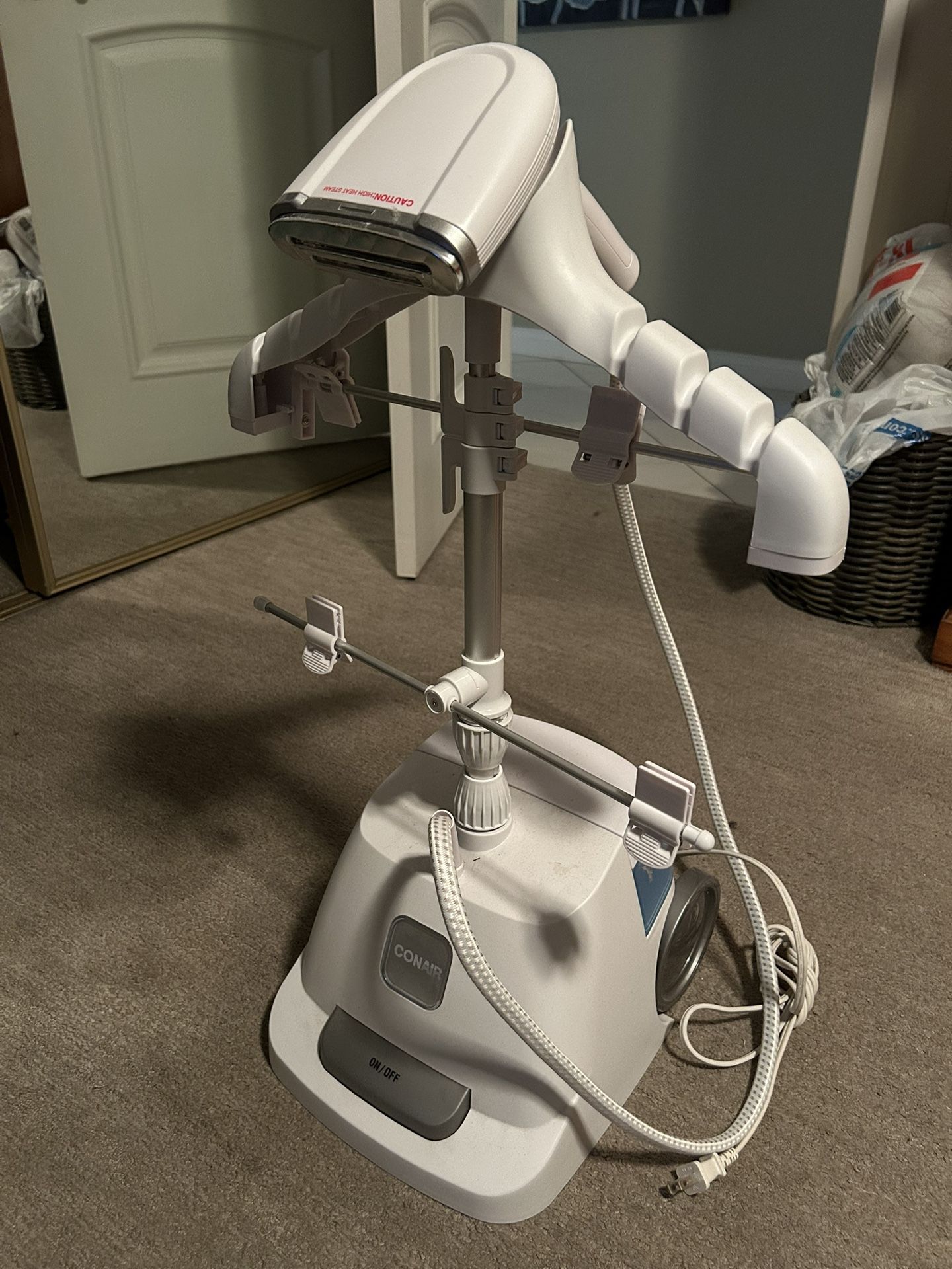 Lightly used Conair standing garment steamer in excellent working condition. Heats up quickly and produces strong steam, perfect for removing wrinkles from clothes, suits, dresses, and curtains. Features: • Upright design with adjustable pole • Built-in hanger with clips • Easy on/off foot pedal • Large water tank • Rolling wheels for easy movement • High and low steam settings Clean, well maintained, and ready to use. Great alternative to ironing.