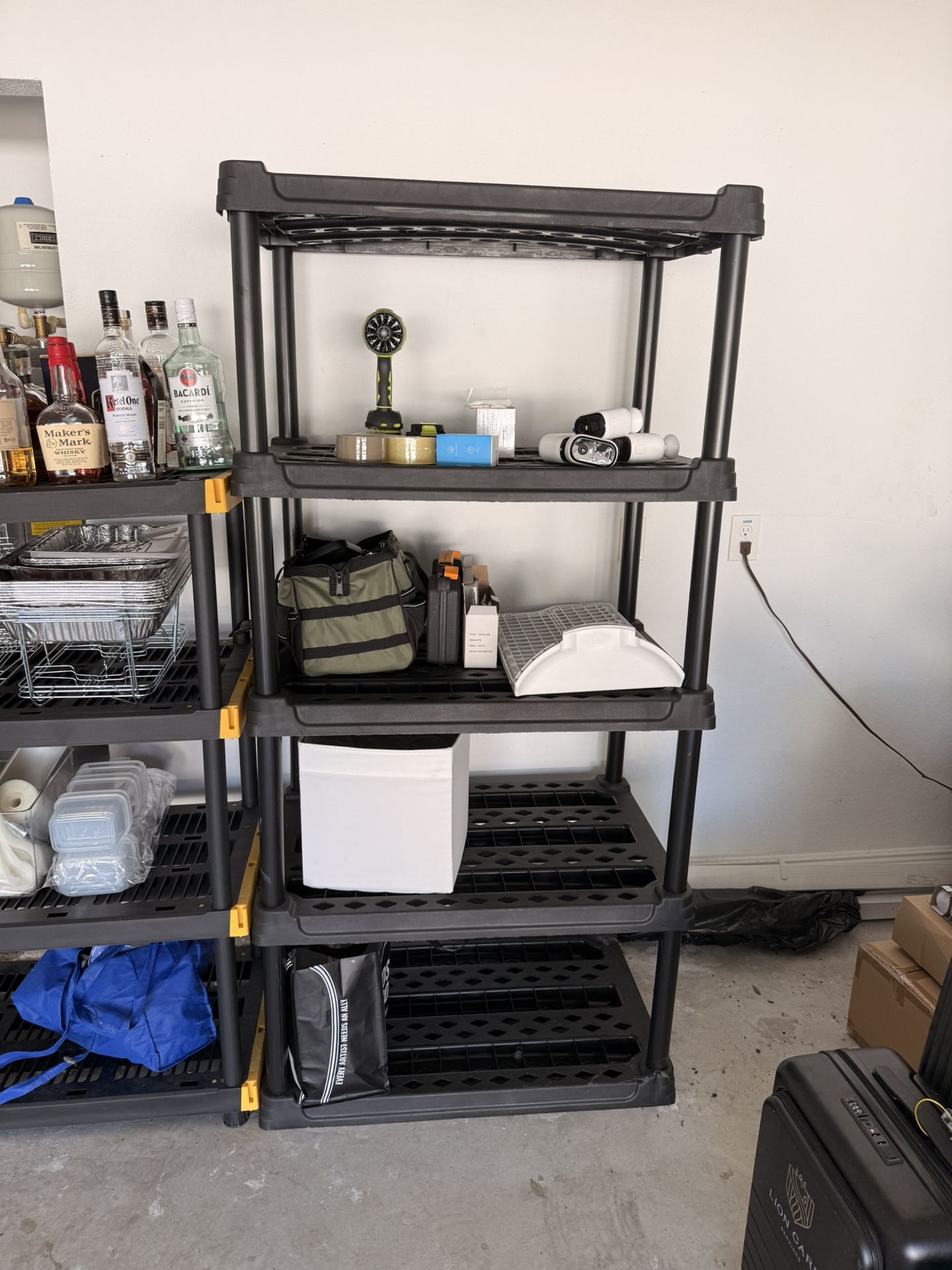 Garage rack $40 very sturdy - 5 layers total I have (2) sets of black $40 each 1 longer set - $50 black and yellow