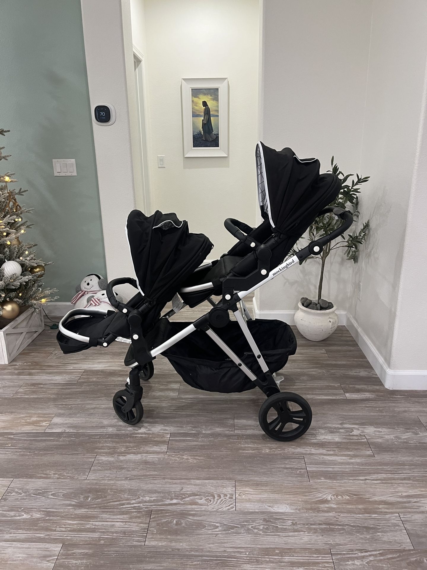 Luxury Mockingbird double stroller with 2nd seat kit, and infant seat insert. Hardly used, like new condition This is a top rated stroller, always showing up as a highly requested baby registry item. Retail Value $769 Easy set up and take down. Works great on multiple terrains and has a big basket in the bottom. Has extra large canopy and peak-a-book window on top. Footrest and hand rail for kids. Adjustable lean and footrest for the kids. Great for a growing family, works for 1 child and can easily add attachments to transition from 1 to 2 kids. See https://offerup.com/redirect/?o=aGVsbG9tb2NraW5nYmlyZC5jb20= website for all details