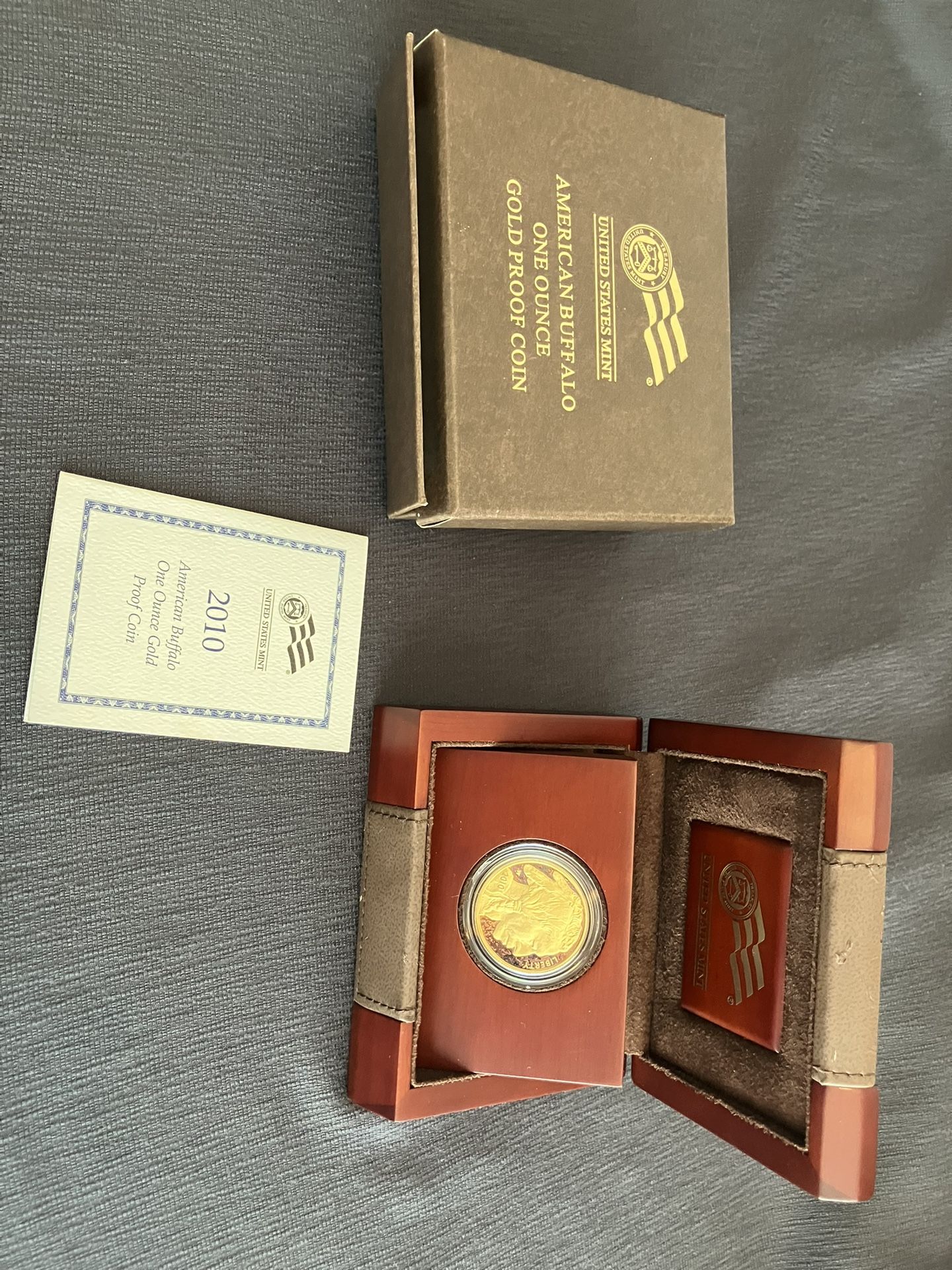 This 2010W gold buffalo proof from the US mint is a perfect coin and is packaged in its original mahogany case with COA. It’s also a smart investment with gold prices continuing to rise. Keep or give as a holiday gift to treasure. $4700, meet with cash only.