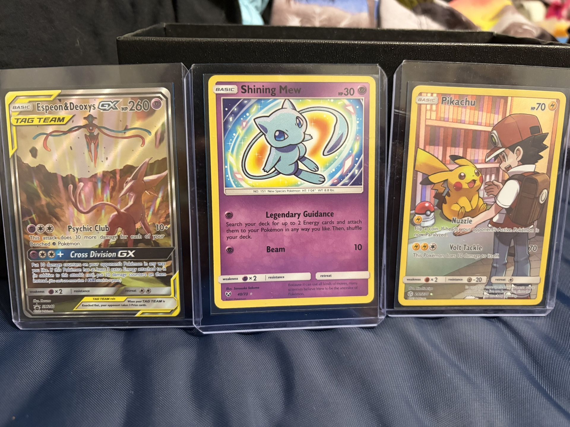 Espeon & deoxys GX tag team from Sun and Moon $101 market Shinning Mew from shinning legends $87 market Pikachu from cosmic eclipse $132 market